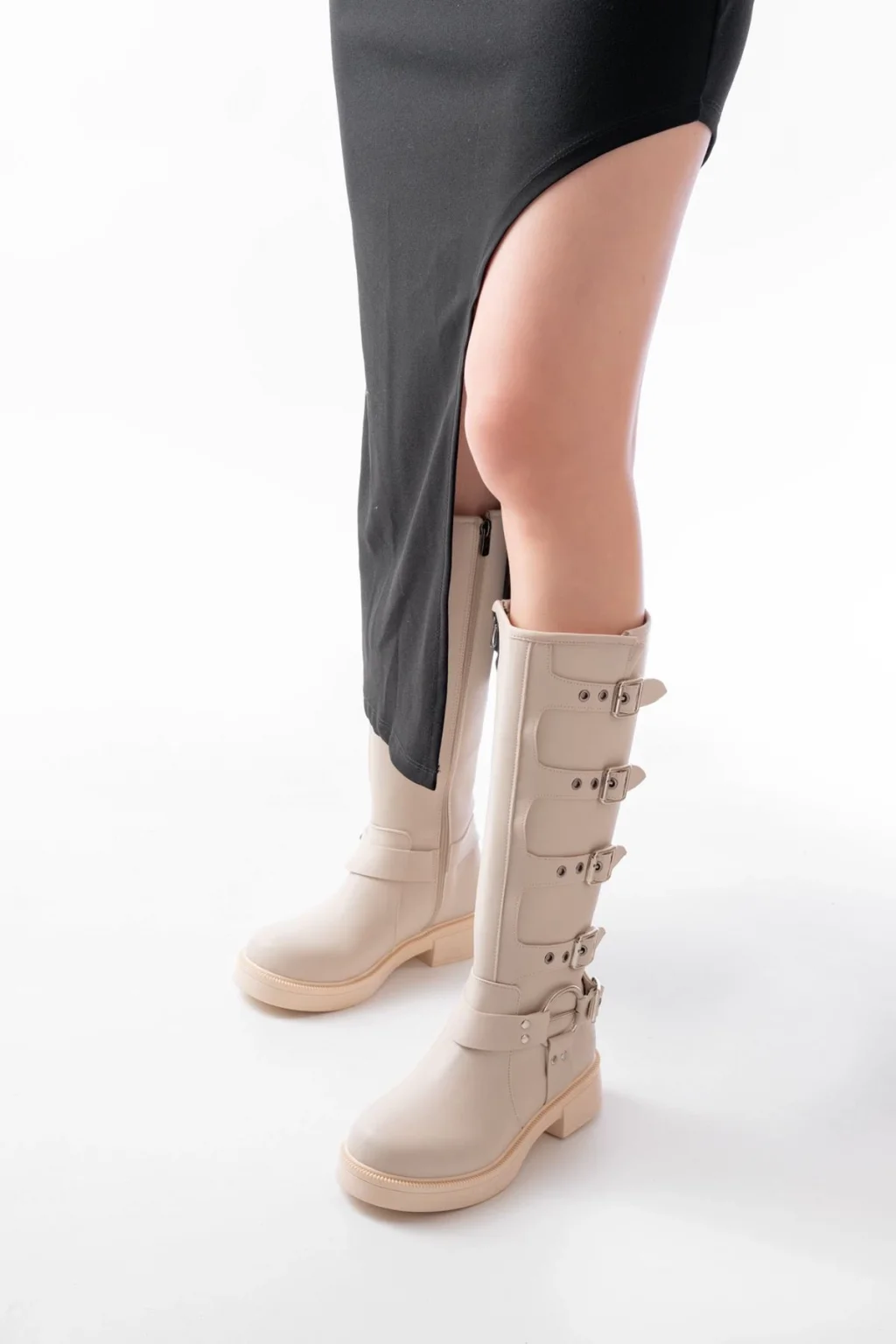 02-312 Bej Toka Aksesuarlı Fermuarlı Günlük Kadın Çizme