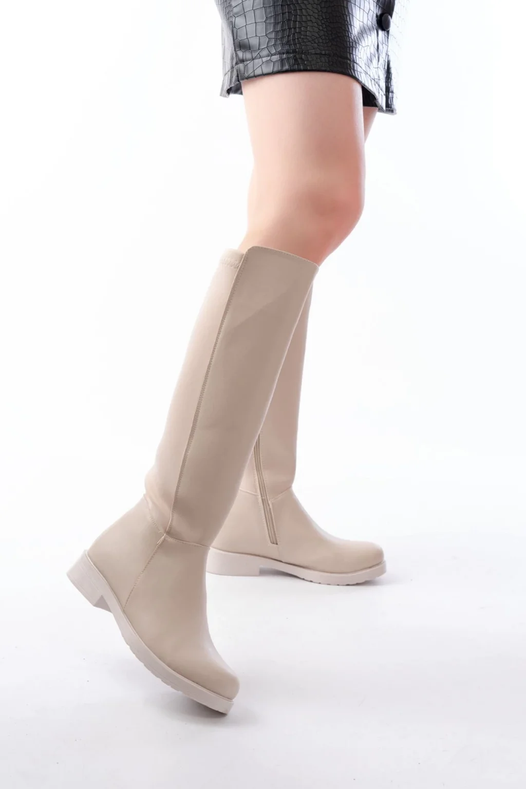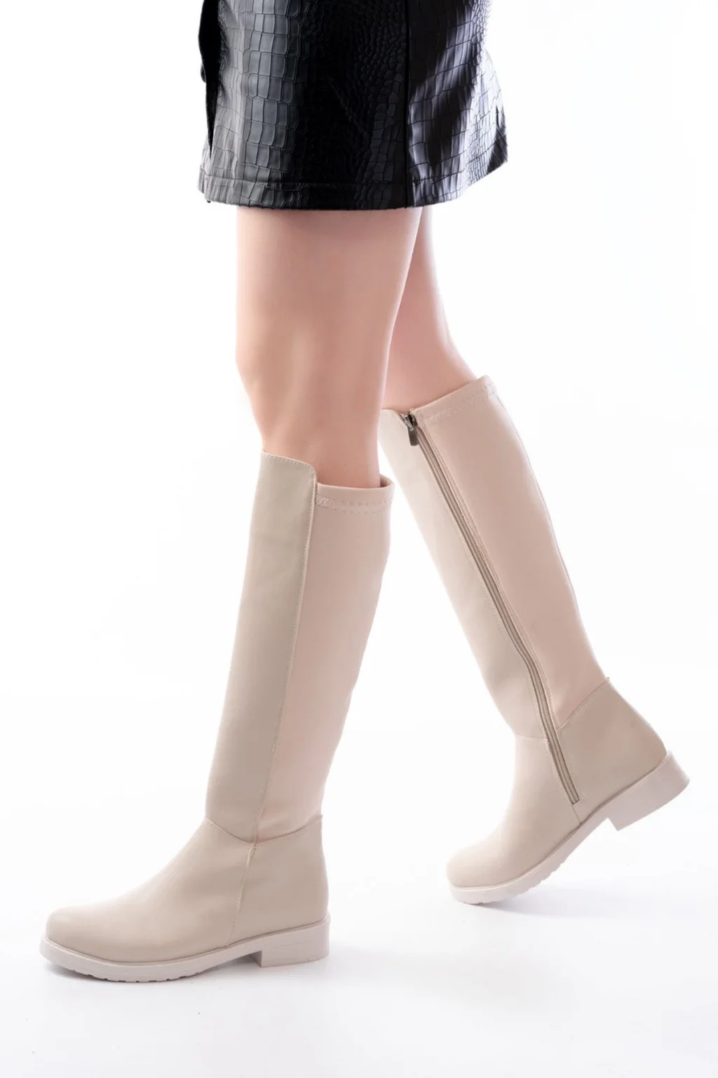 812-305 Bej Arkası Streç Fermuarlı Günlük Kadın Çizme