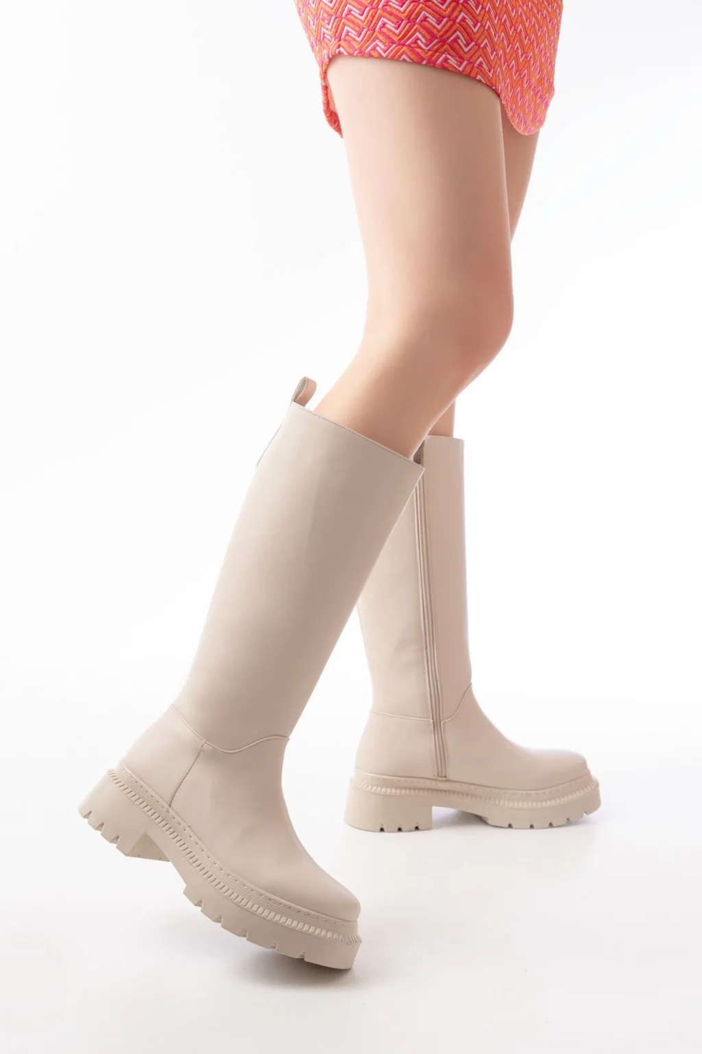 812-2194 Bej Fermuarlı Diz Üstü Bağcıklı Çorap Günlük Kadın Çizme