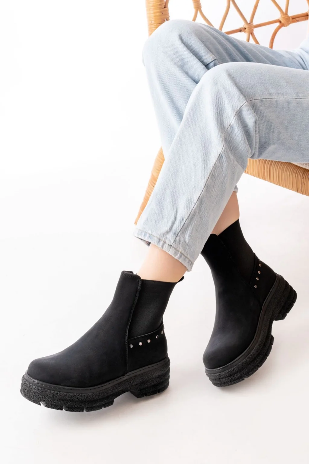 02-02 Siyah Süet Taş Aksesuarlı Lastikli Günlük Kadın Bot