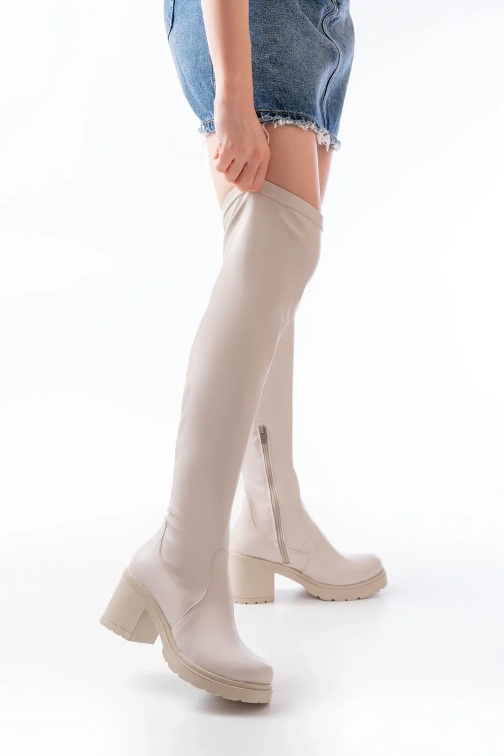 812-2194 Bej Fermuarlı Diz Üstü Bağcıklı Çorap Günlük Kadın Çizme