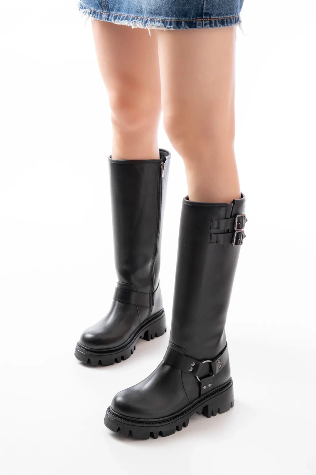 02-312 Siyah Toka Aksesuarlı Fermuarlı Günlük Kadın Çizme