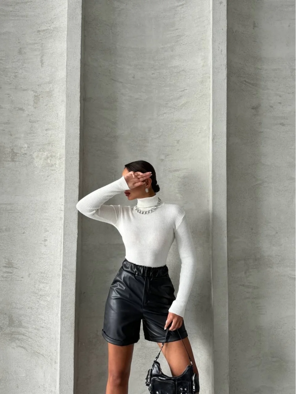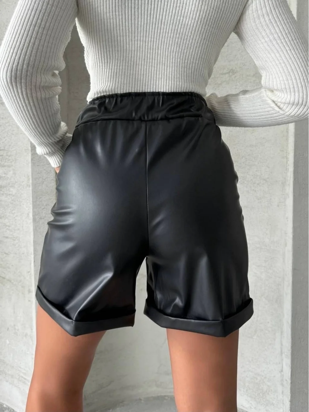 Şıklık ve rahatlık arayan kadınlar için ideal bir seçenek olan Beli Lastikli Duble Paça Deri Şort Siyah, gardırobunuzun vazgeçilmezi olmaya aday!