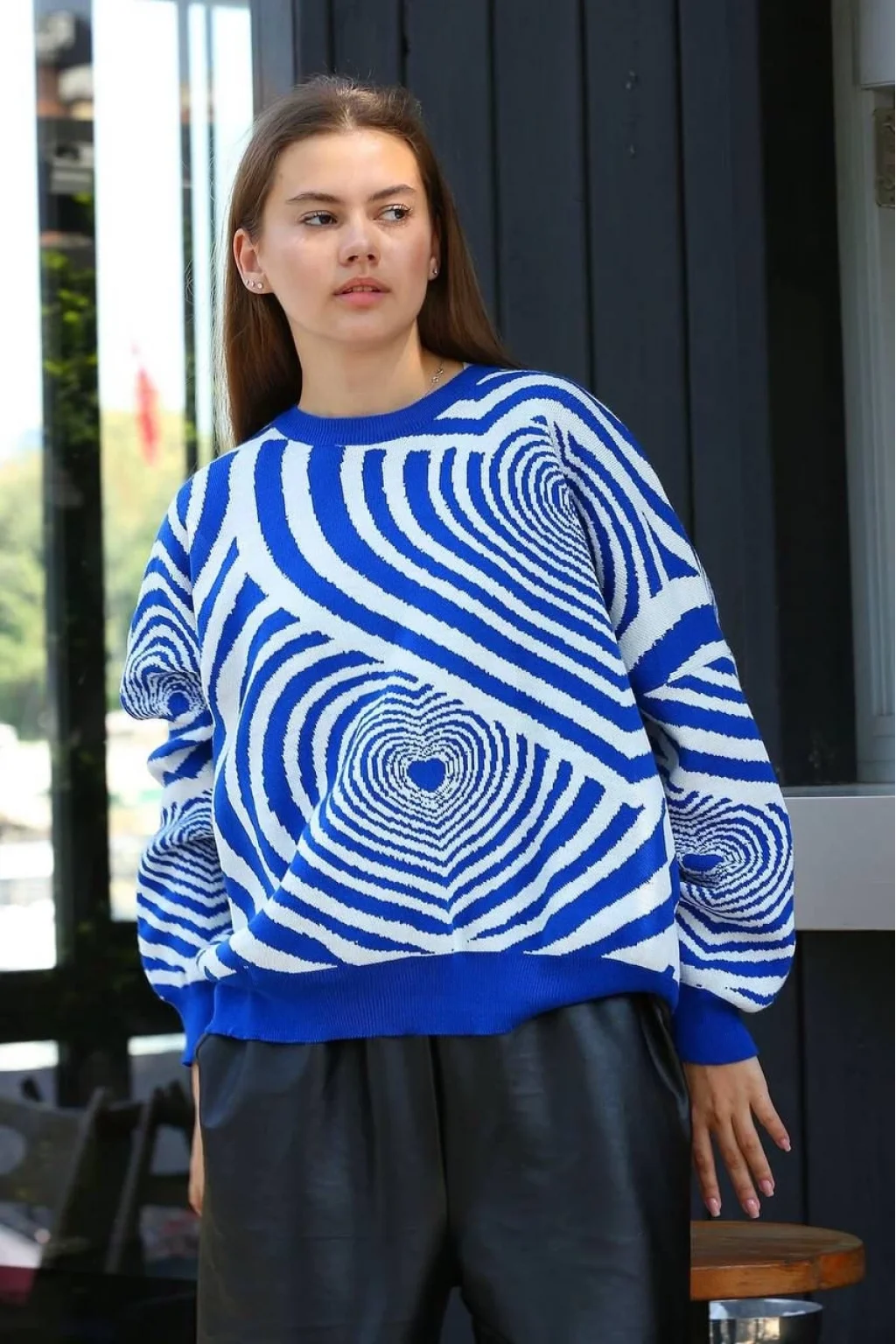 Şıklığı ve rahatlığı bir arada sunan Beyaz Kalp Çizgili Kazak, gardırobunuzun vazgeçilmez parçalarından biri olmaya aday!
