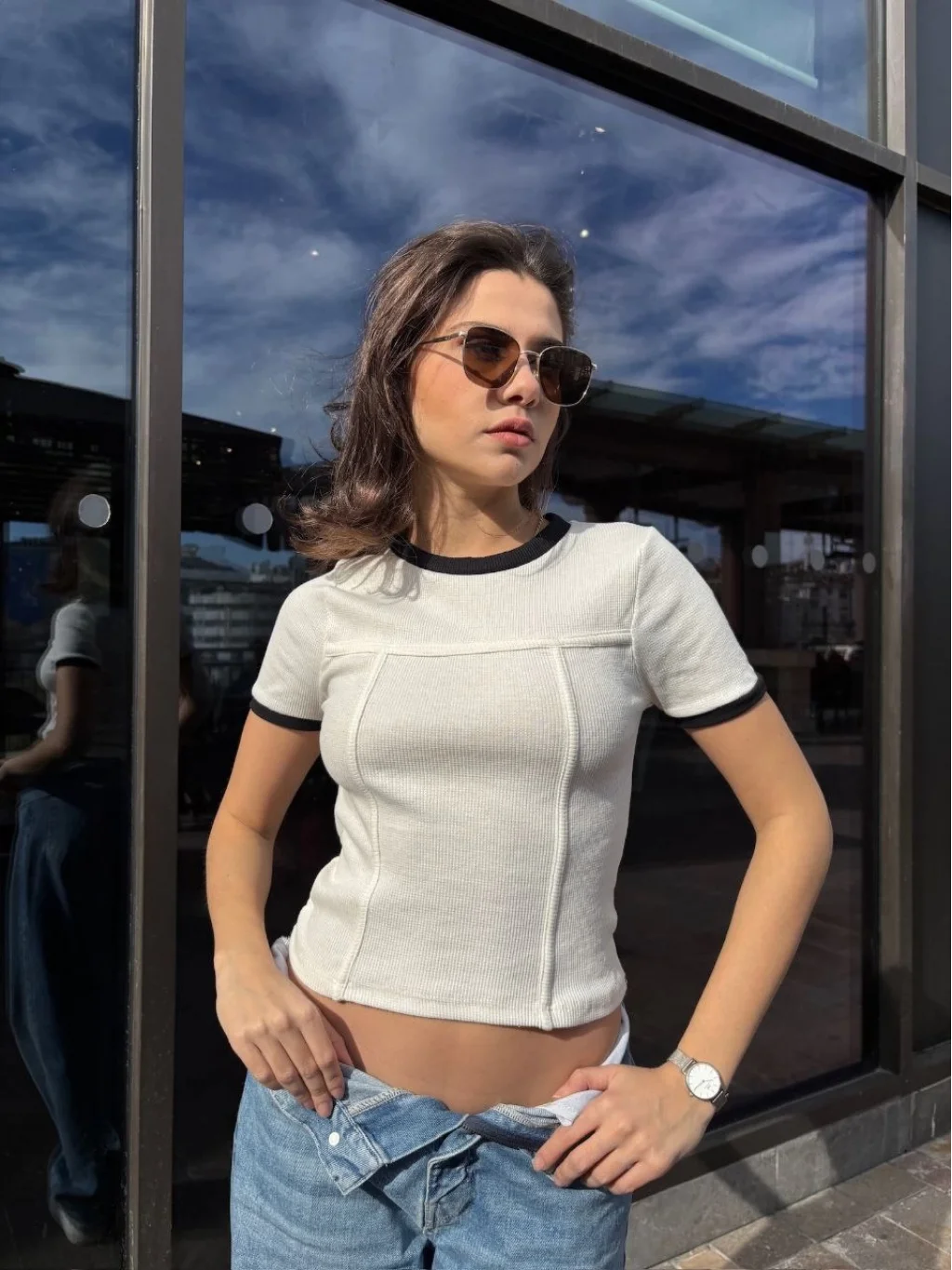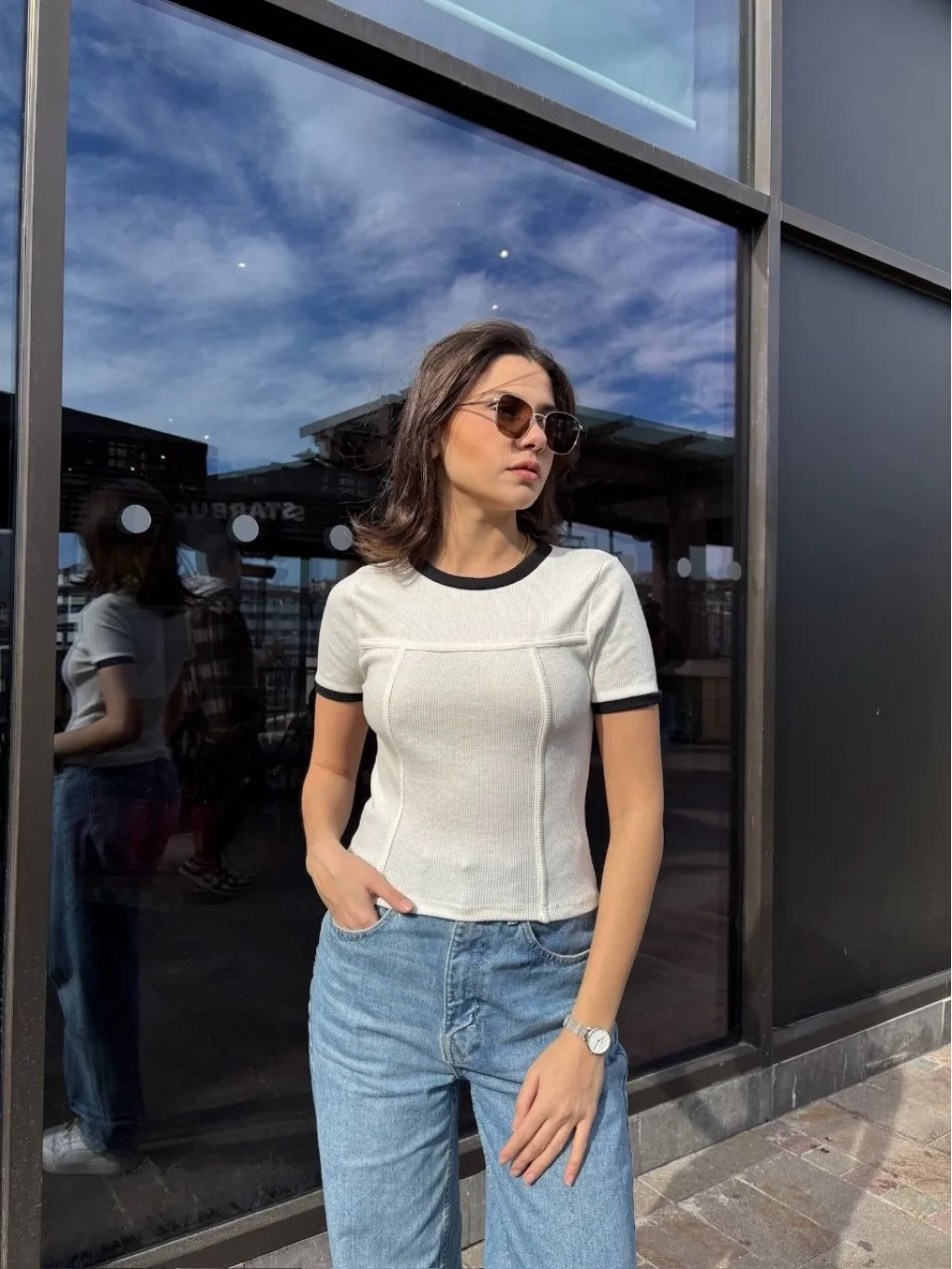 • V yaka detayı ile feminen bir görünüm sunar.
