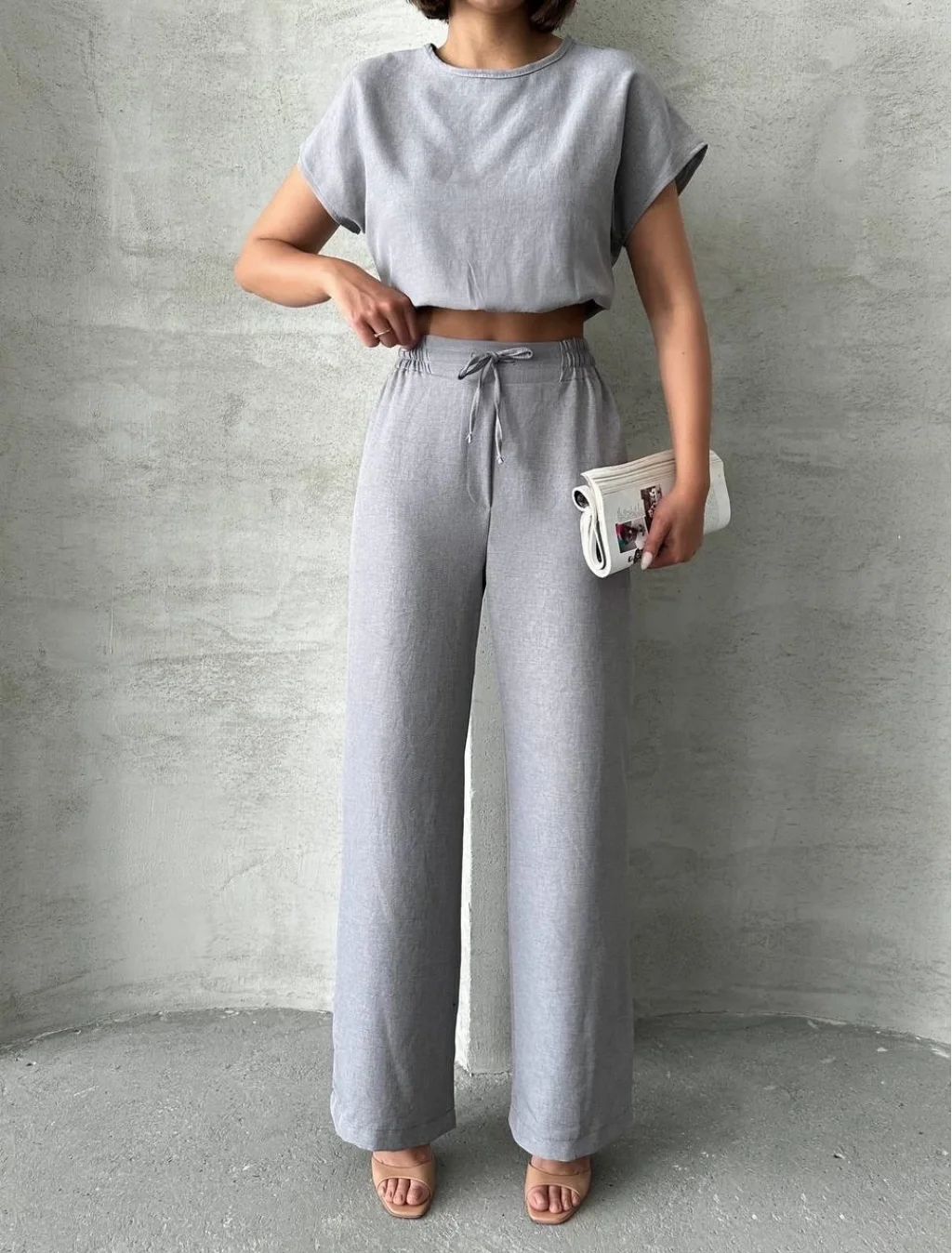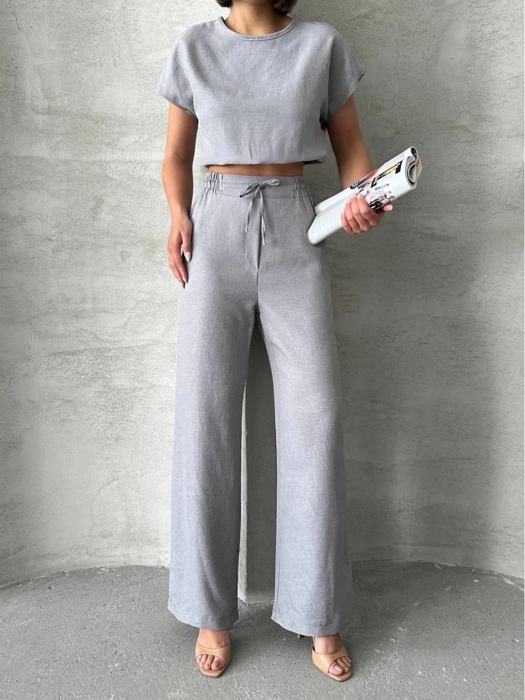 • Bluzunun düz kesimi ve pantolonunun yüksek bel tasarımı ile trend bir stil sunar.