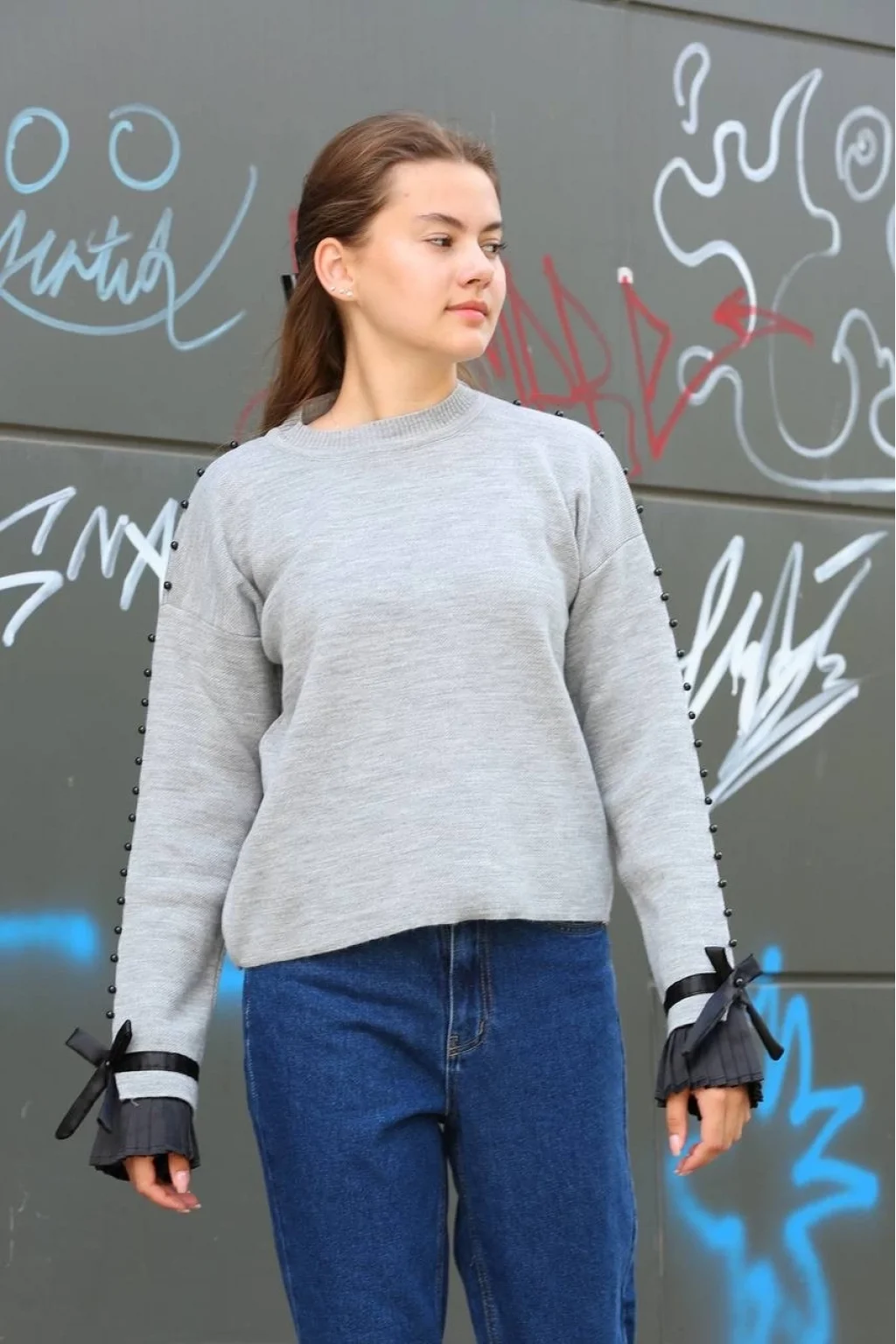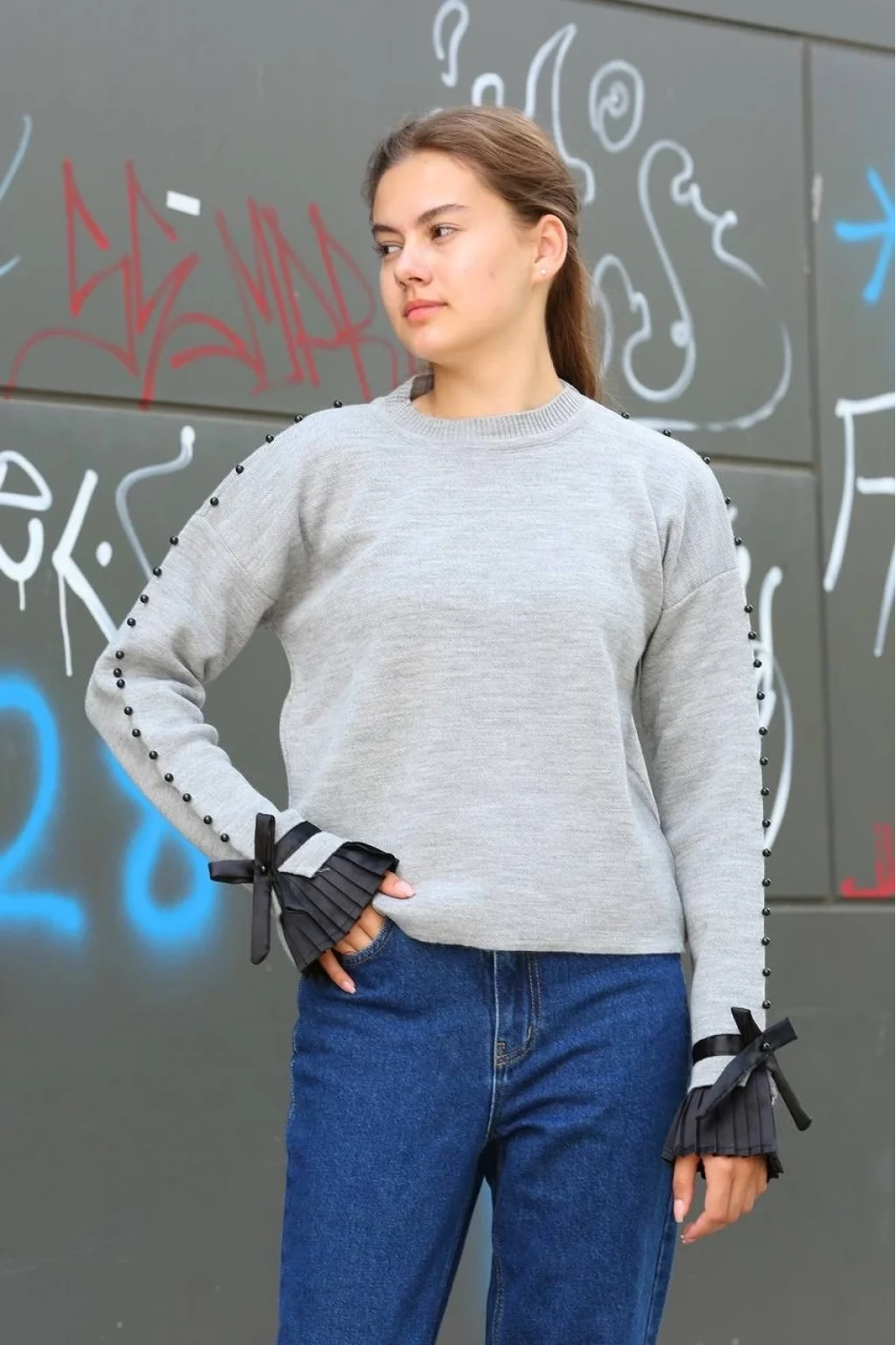 Boncuklu bile detaylı kazak gri