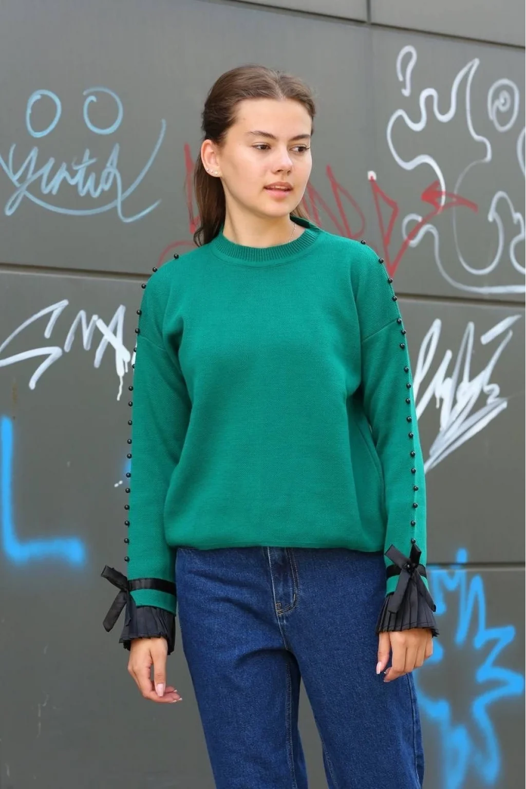 Şıklığı ve rahatlığı bir arada sunan Petrol Yeşili Boncuklu Detaylı Kazak, gardırobunuzun vazgeçilmez parçası olmaya aday!
