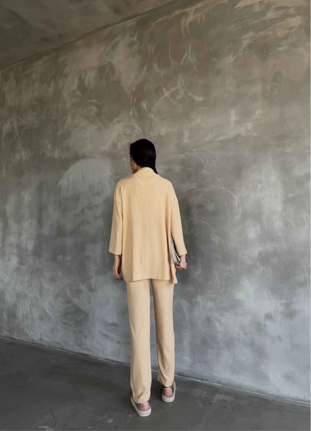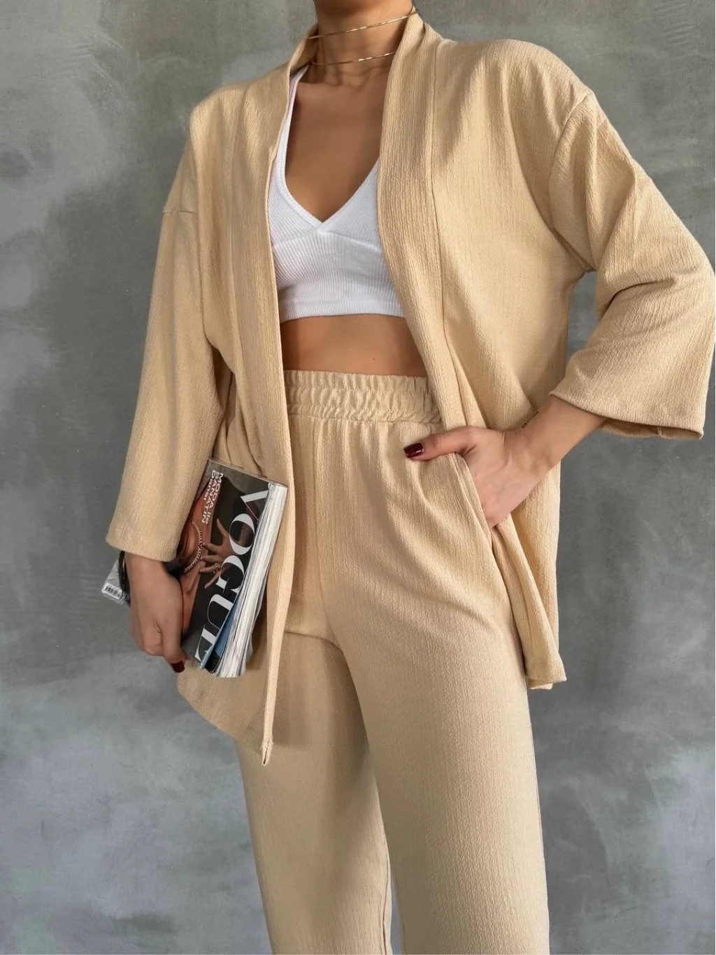 Bu bürümcük kumaş yakımlı kadın giyim takımı ile hem şık hem de rahat bir tarz yaratmak artık çok daha kolay.