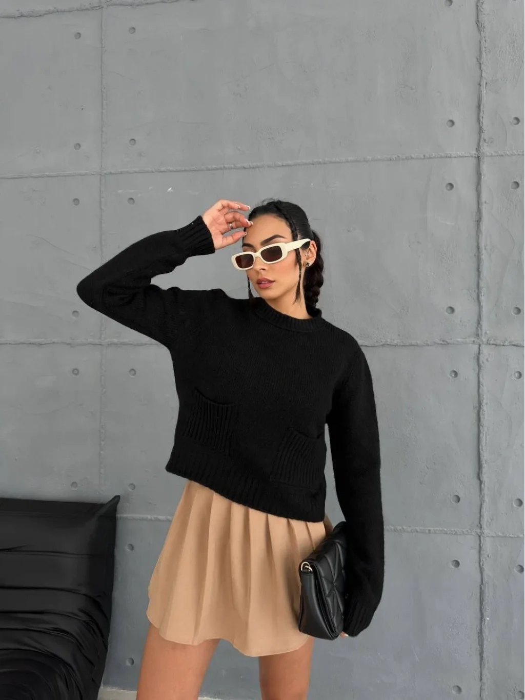 Yeni sezonda trend olan cepli triko kazak siyah rengiyle öne çıkıyor. Hem şık hem de kullanışlı olan bu kazak, gardırobunuzun vazgeçilmezi olmaya aday. İnce triko kumaşı sayesinde hafif ve rahattır.