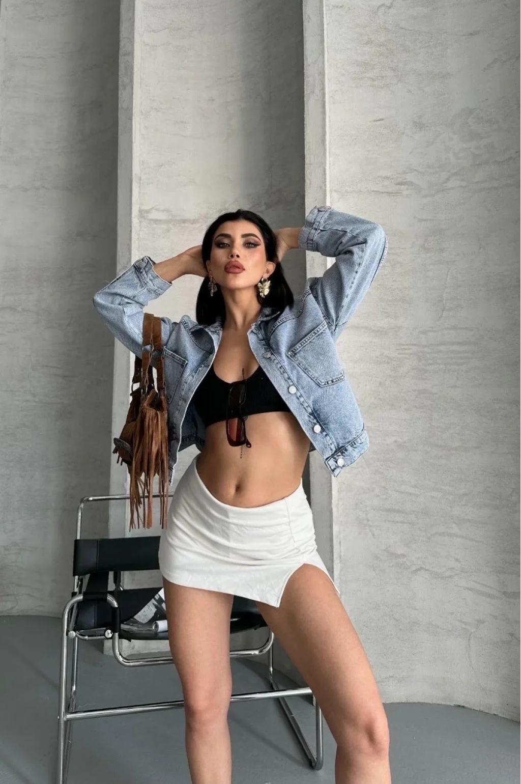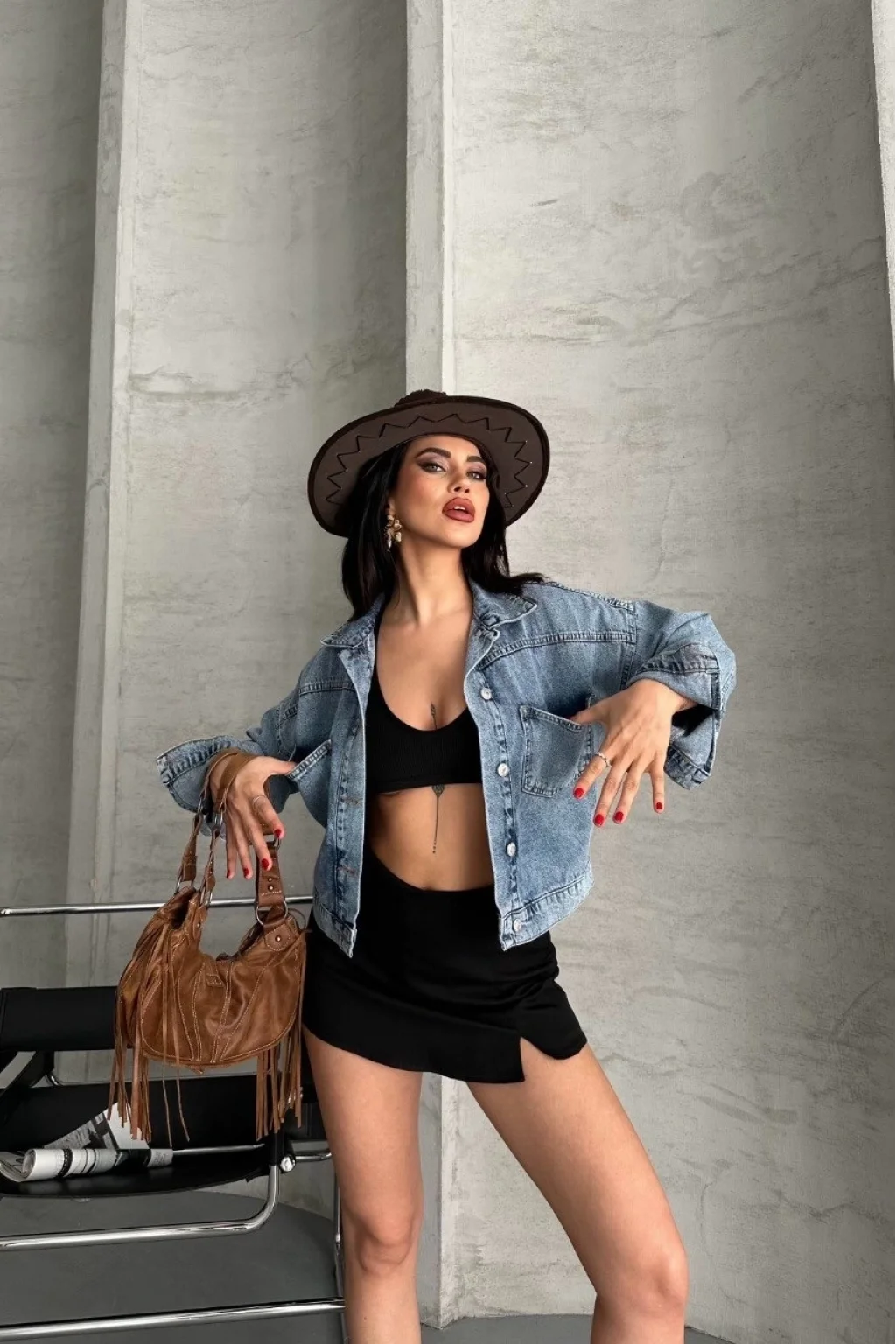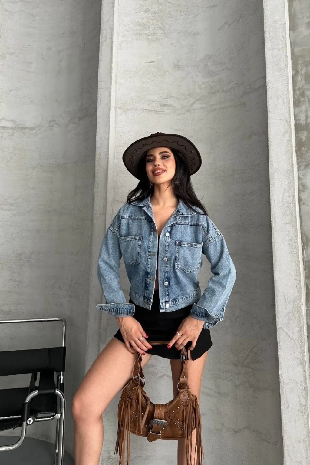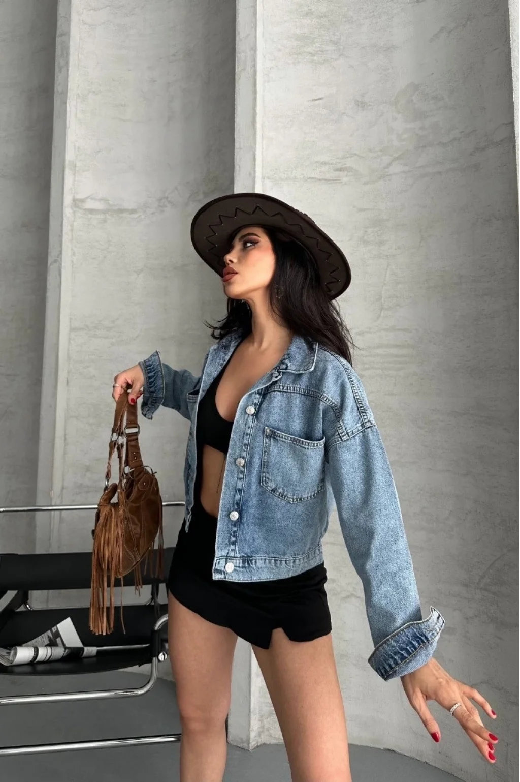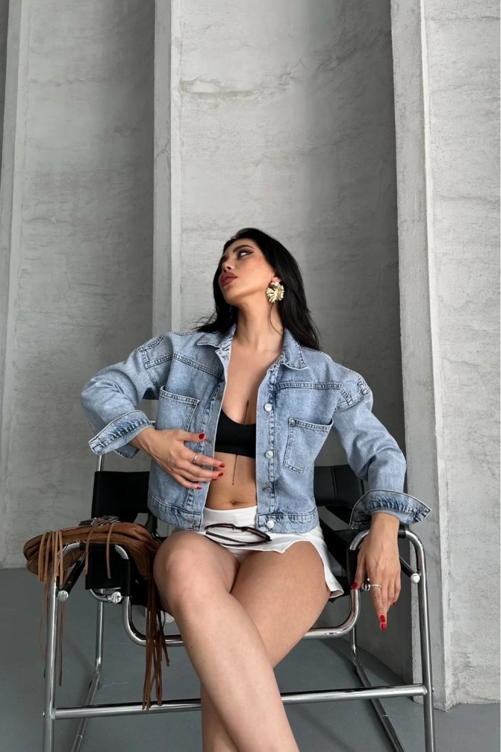 Tarzınızı yansıtan ve kombinlerinize şıklık katacak Çift Cepli Kol Katlamalı Kar Yıkama Crop Kot Ceket Mavi, gardırobunuzun vazgeçilmez parçalarından biri olmaya aday!