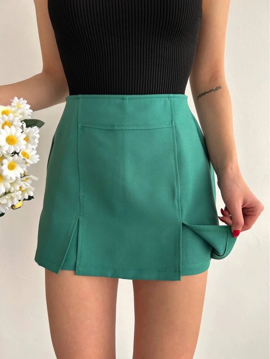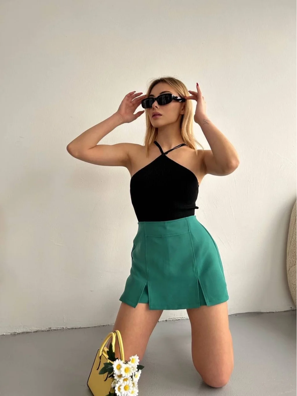 Çift yırtmaç detayıyla öne çıkan yeşil atlas şort etek, gardırobunuzun favori parçalarından biri olmaya aday.