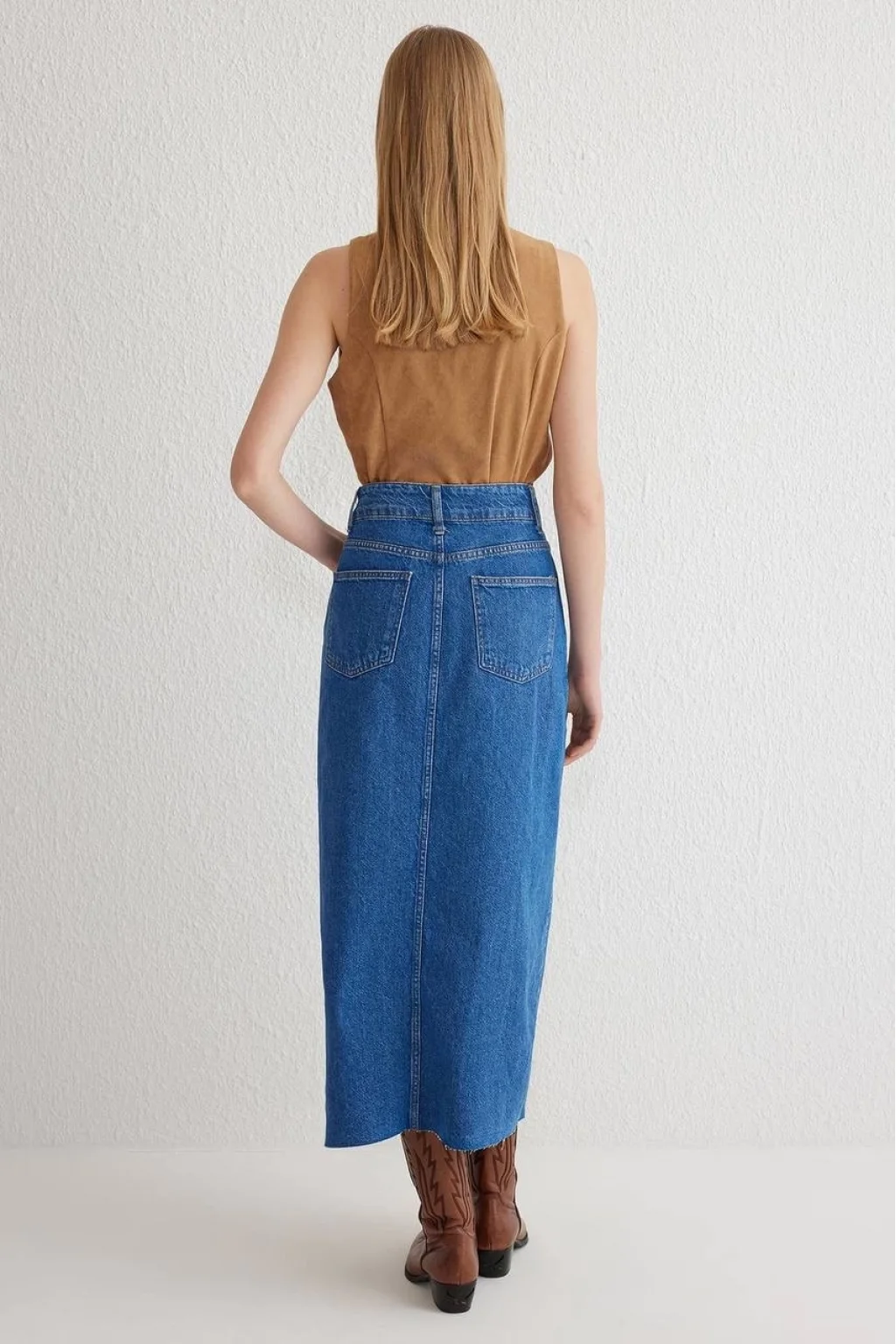 Çeşitli üst kıyafetlerle kolayca kombin yapabileceğiniz S140 çift yırtmaçlı jean etek, gardırobunuzun favori parçalarından biri olmaya aday!