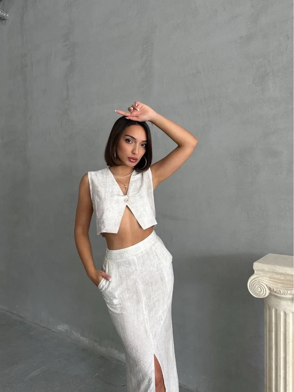KAZAX markasının şık ve zarif tasarımıyla öne çıkan çilek takımı, etek ve yelek kombinasyonuyla dikkat çekiyor.