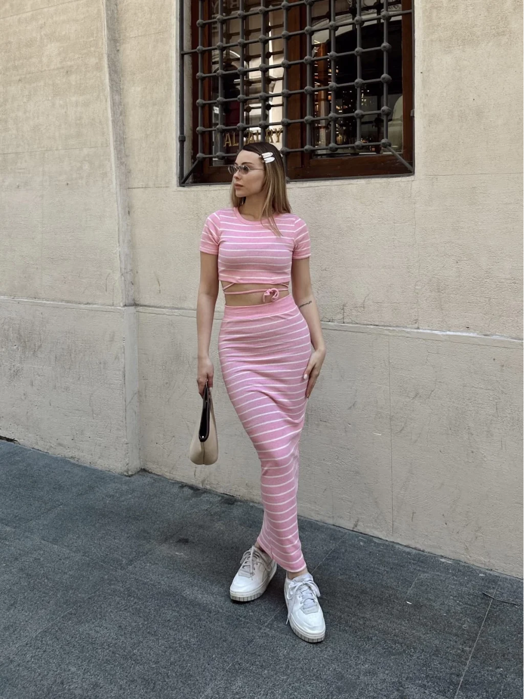 Bu sezonun trendlerine uygun şık ve şık bir seçenek olan Pembe Çizgili Etekli Takım, gardırobunuzun favori parçaları arasında yer alacak. Hem şık hem de rahat tasarımı ile öne çıkan bu takım, her türlü özel buluşma veya günlük aktivite için mükemmel bir seçimdir.
