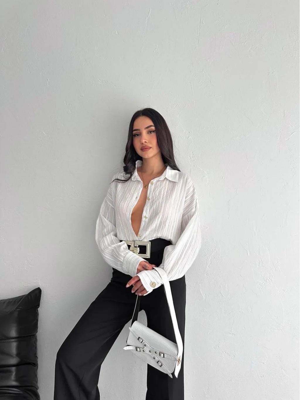 KAZAX çizgili oversize gömlek, rahat ve şık bir görünüm sunar.