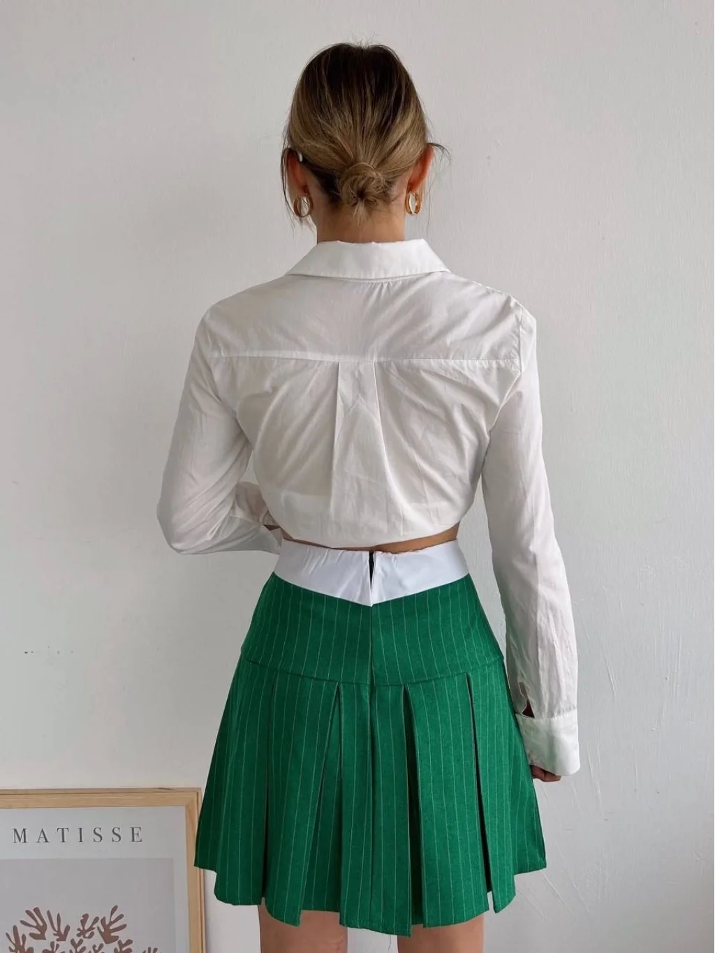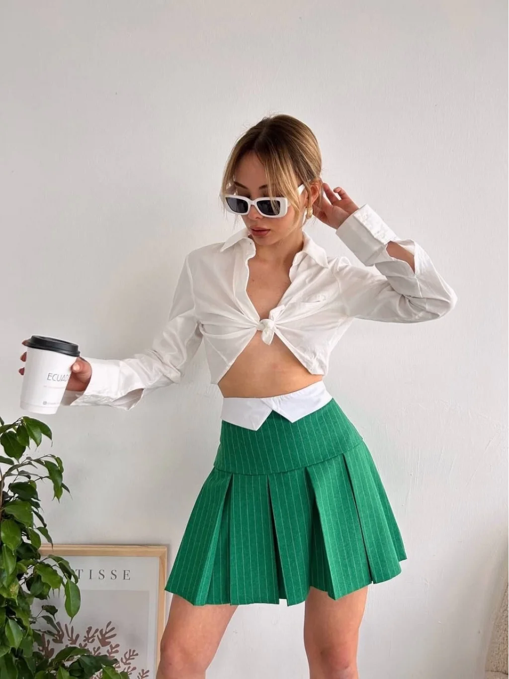 Bu çizgili pileli etek, şıklığı ve rahatlığı bir arada sunar.