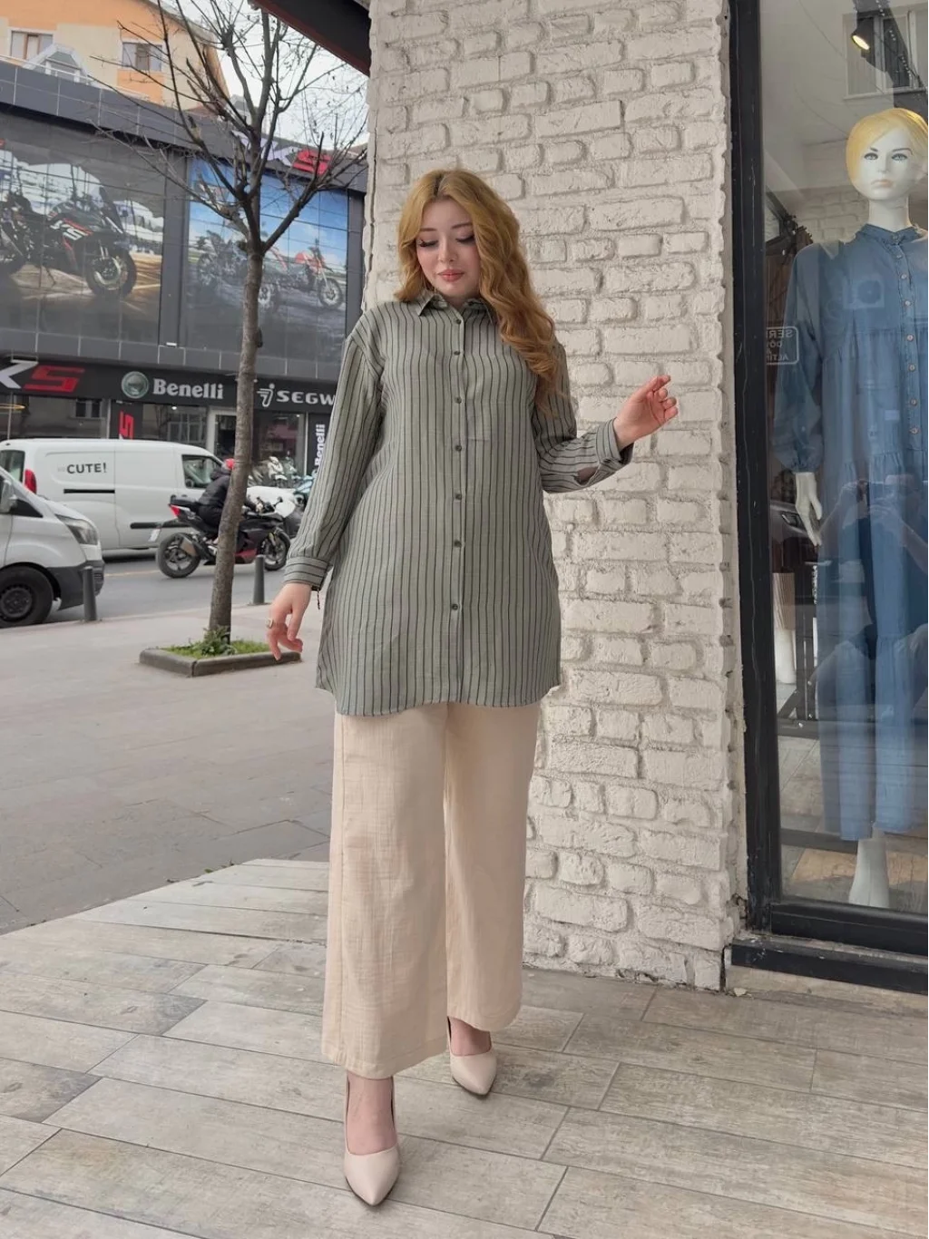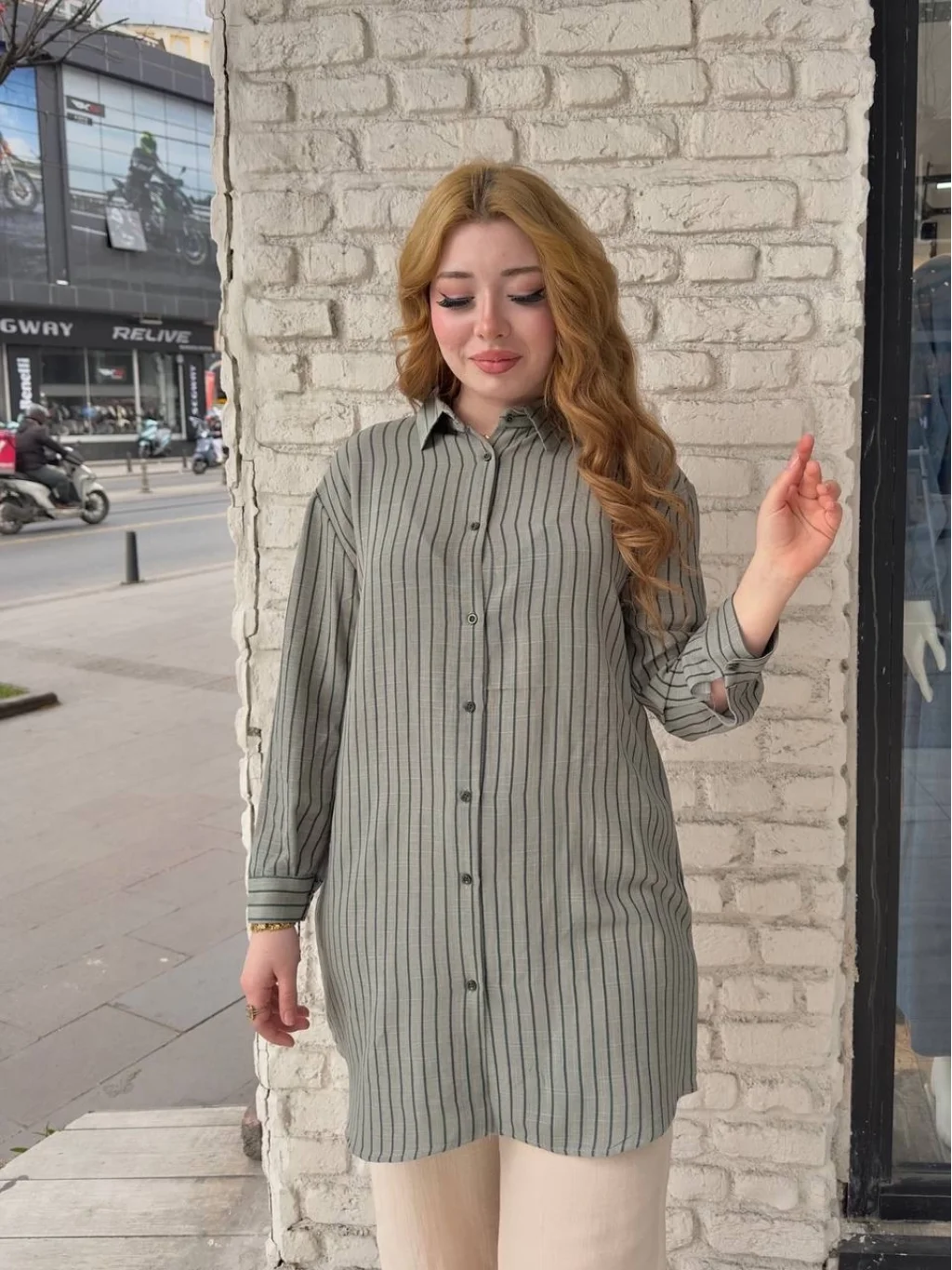 KAZAX çizgili tunik gömlek, şıklığı ve rahatlığı bir arada sunuyor. İster günlük hayatta ister özel günlerde tercih edebileceğiniz bu gömlek, şık çizgili tasarımıyla dikkat çekiyor.