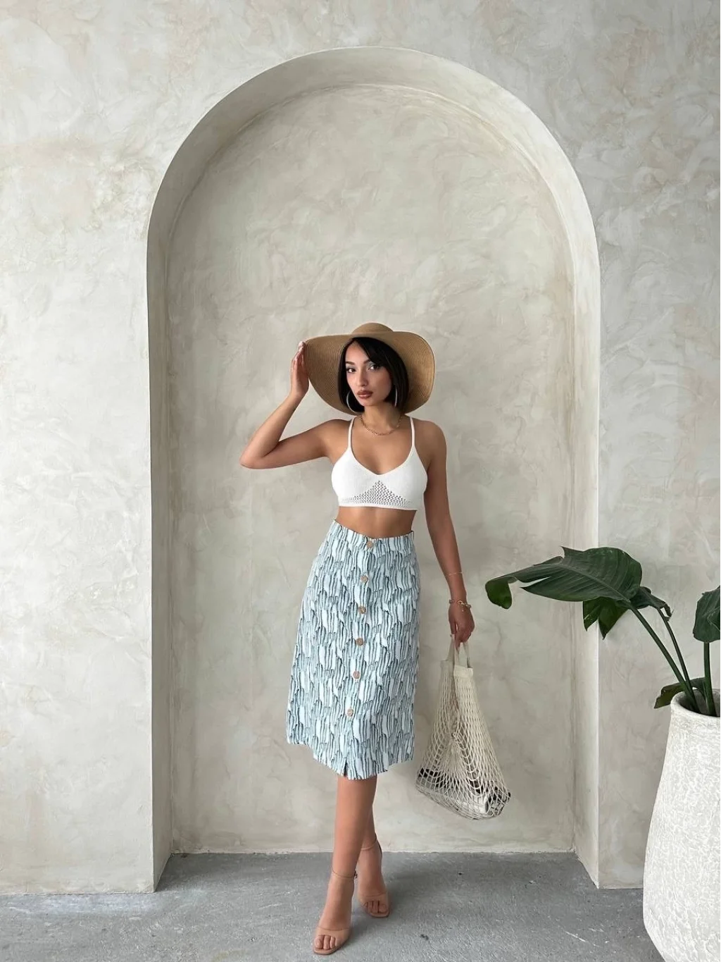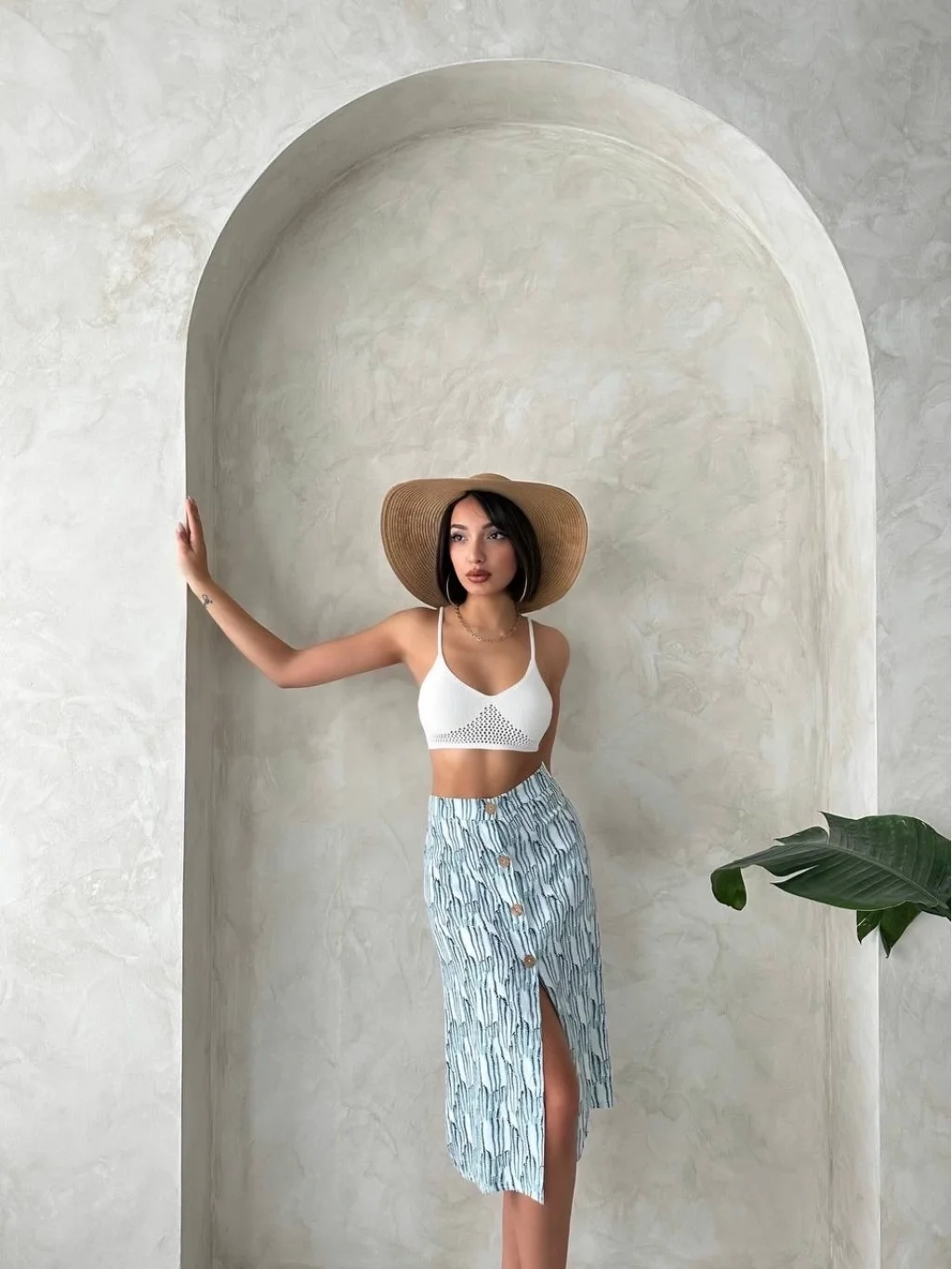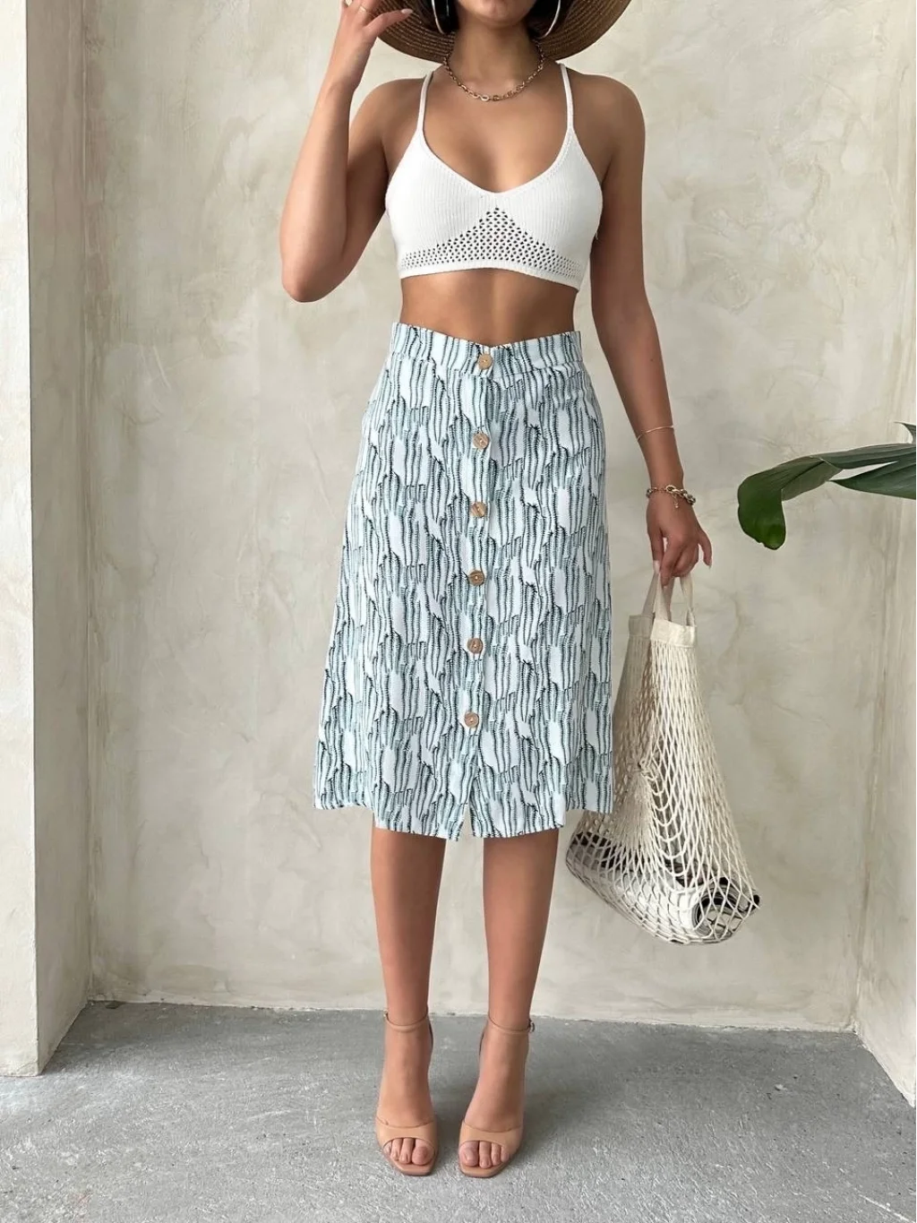 Bu desenli düğmeli etek, şıklık ve rahatlığı bir arada sunuyor. Sade ve zarif tasarımı ile her tarza uyum sağlayan bir parça.