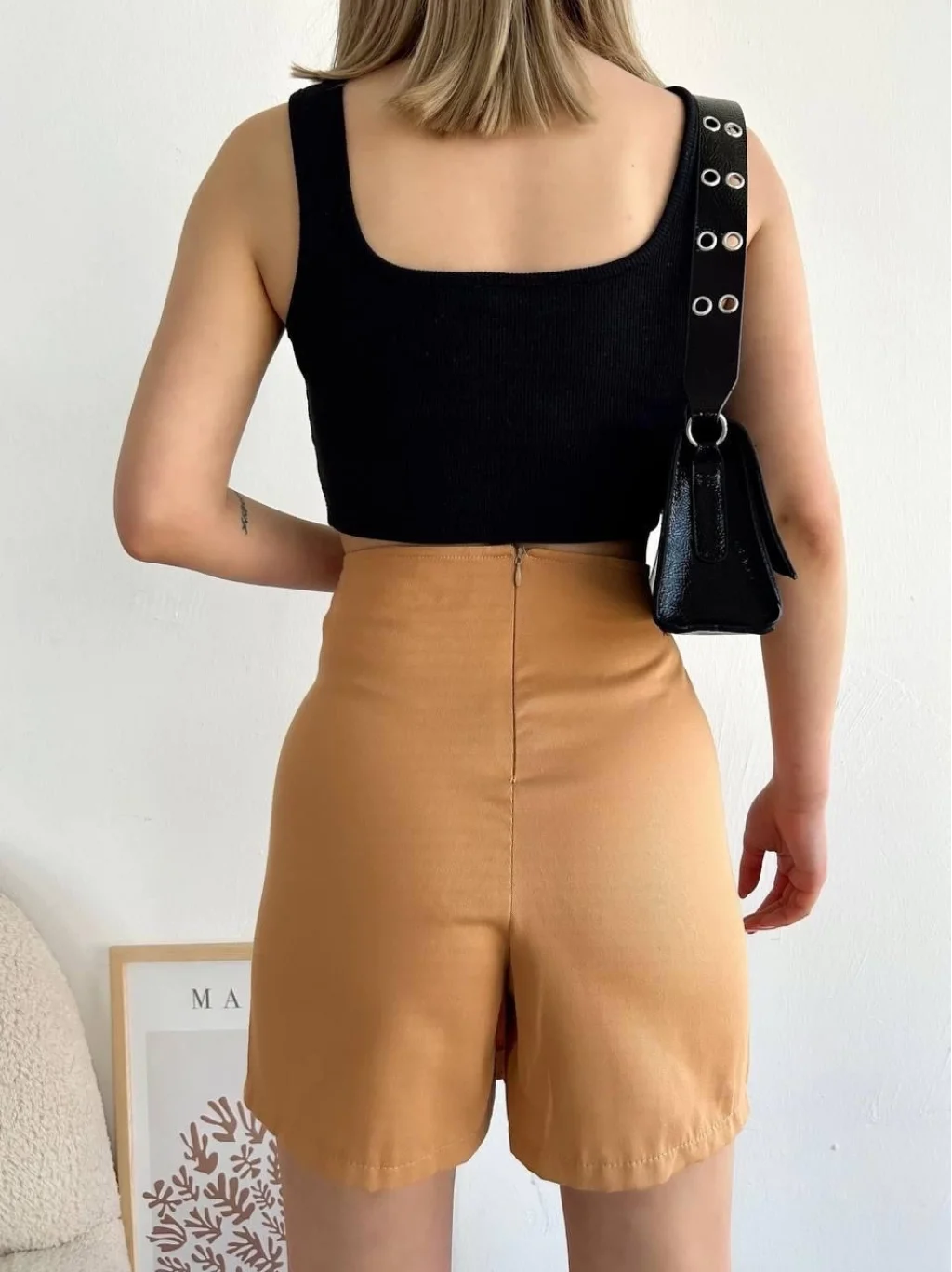 - Yüksek bel tasarımı ile vücudu saran şort etek, şık bir görünüm sunar.