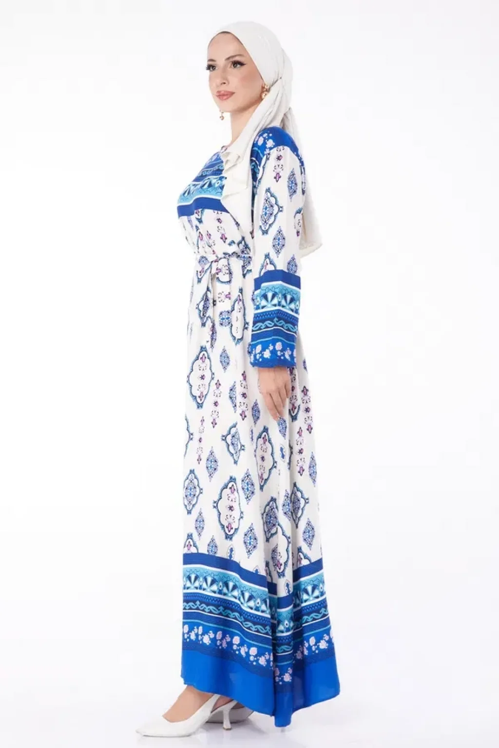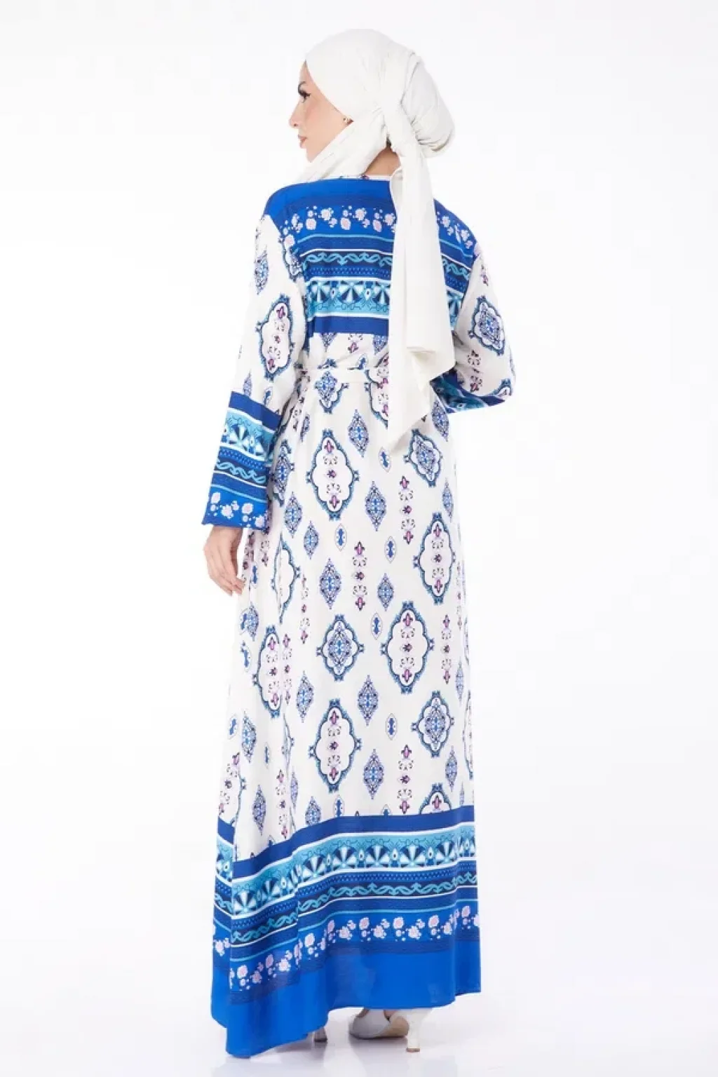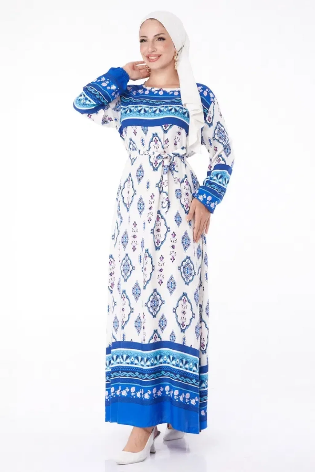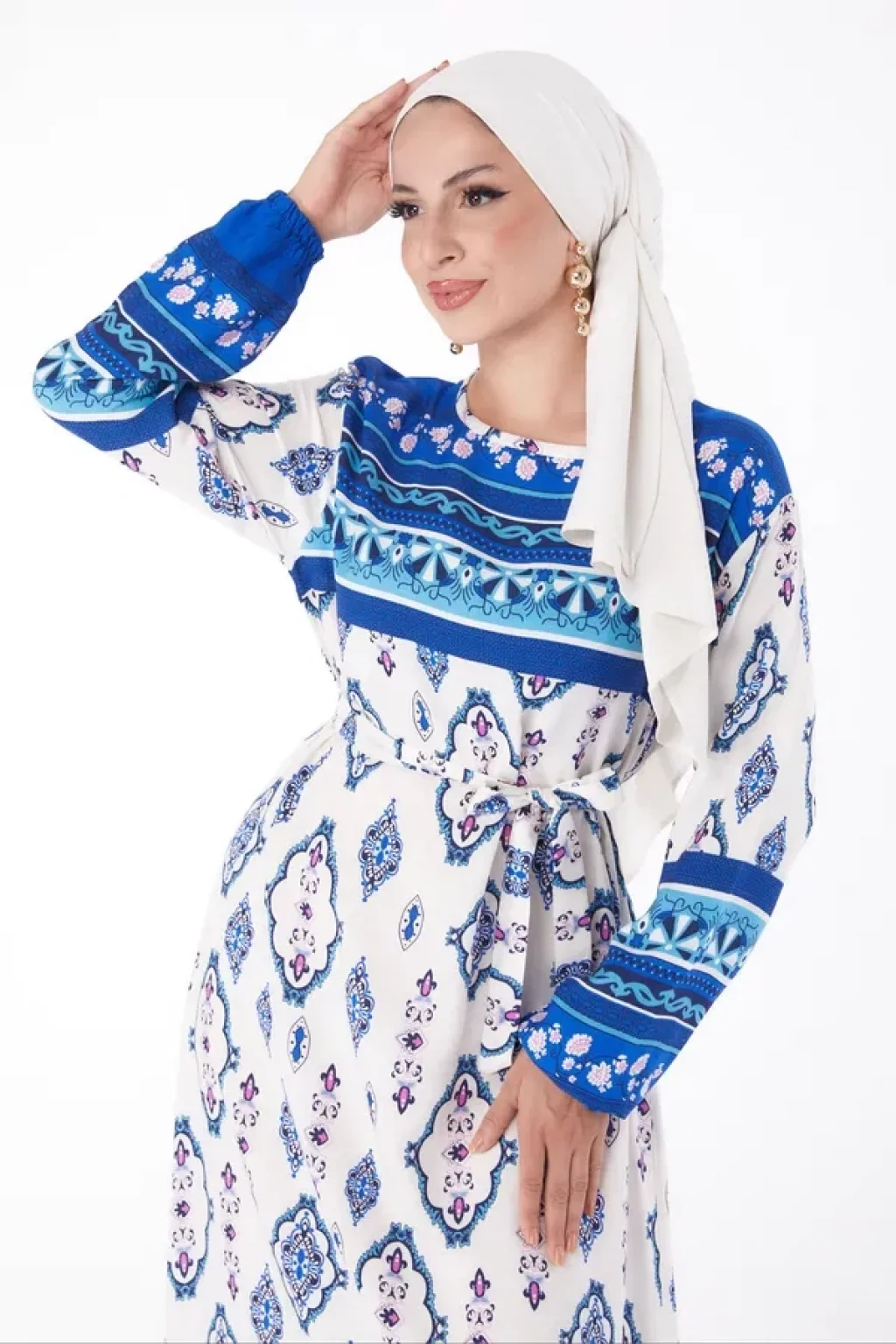 Düz Bisiklet Yaka Kadın Mavi Etnik Desenli Elbise, KAZAX marka kadın giyim koleksiyonunun şık ve rahat parçalarından biridir.
