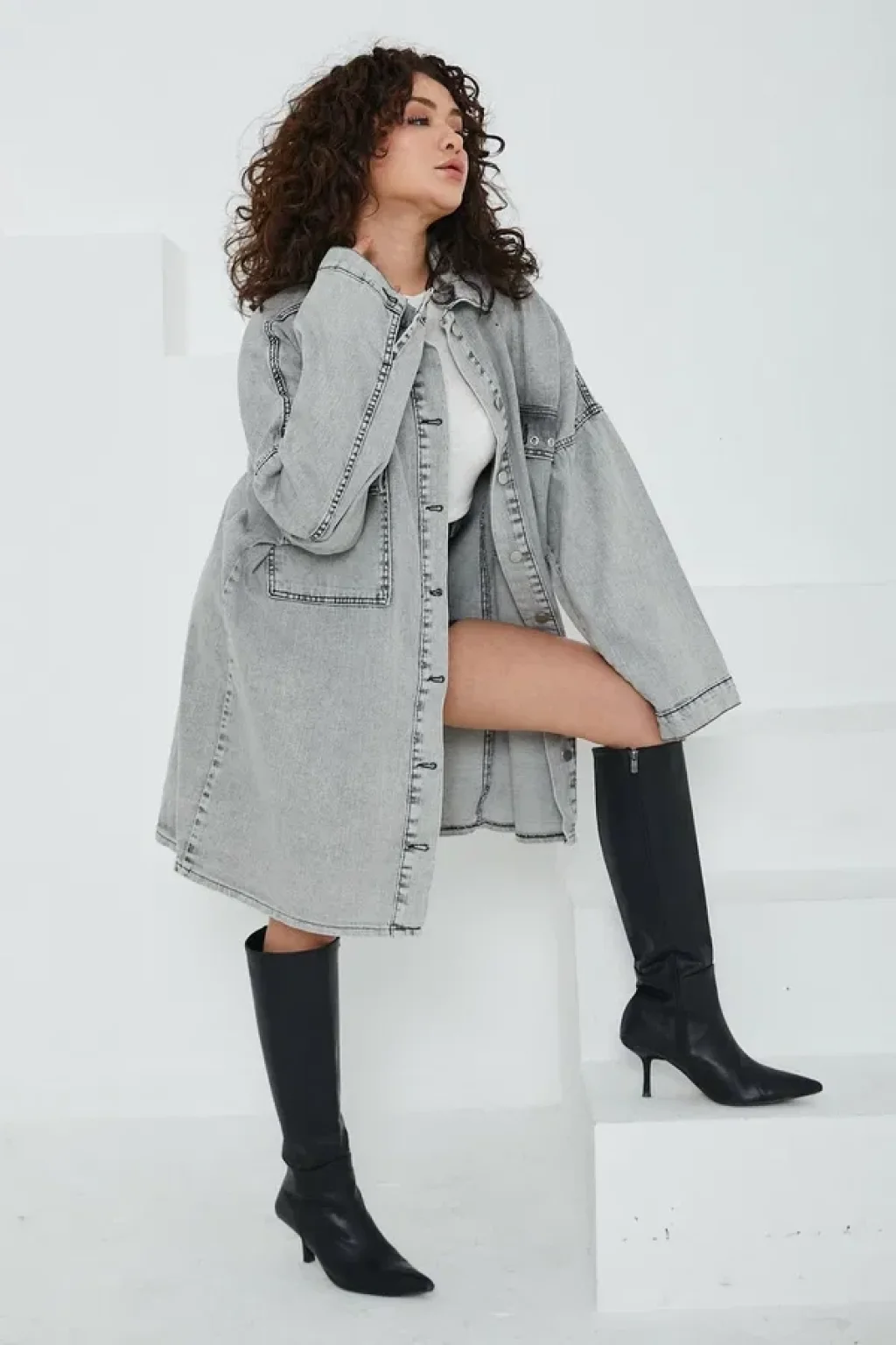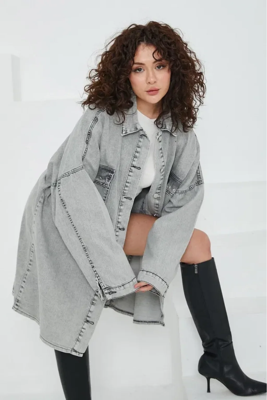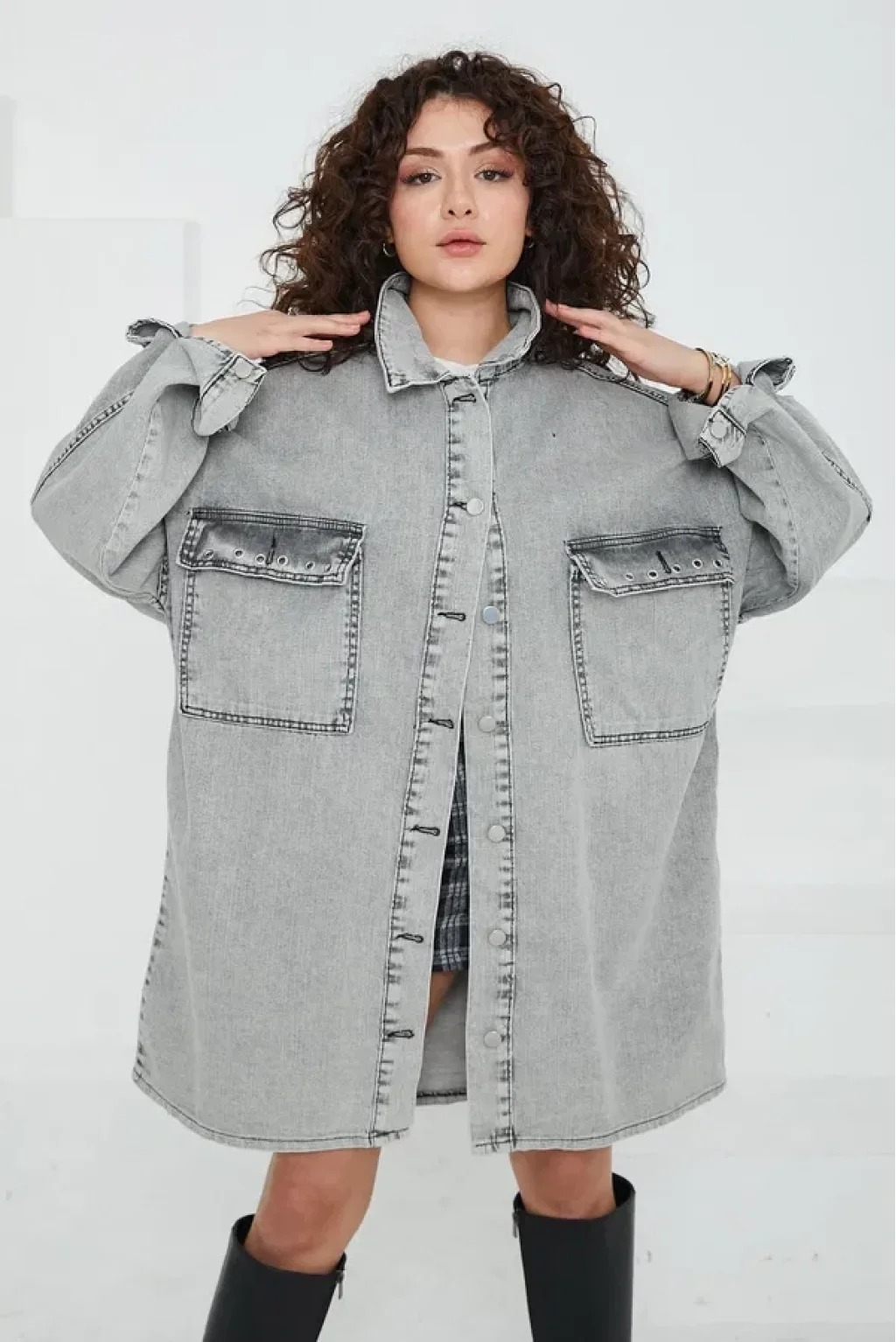 Düz Gömlek Yaka Kadın Gri Kuş Gözü Cepli Kot Ceket