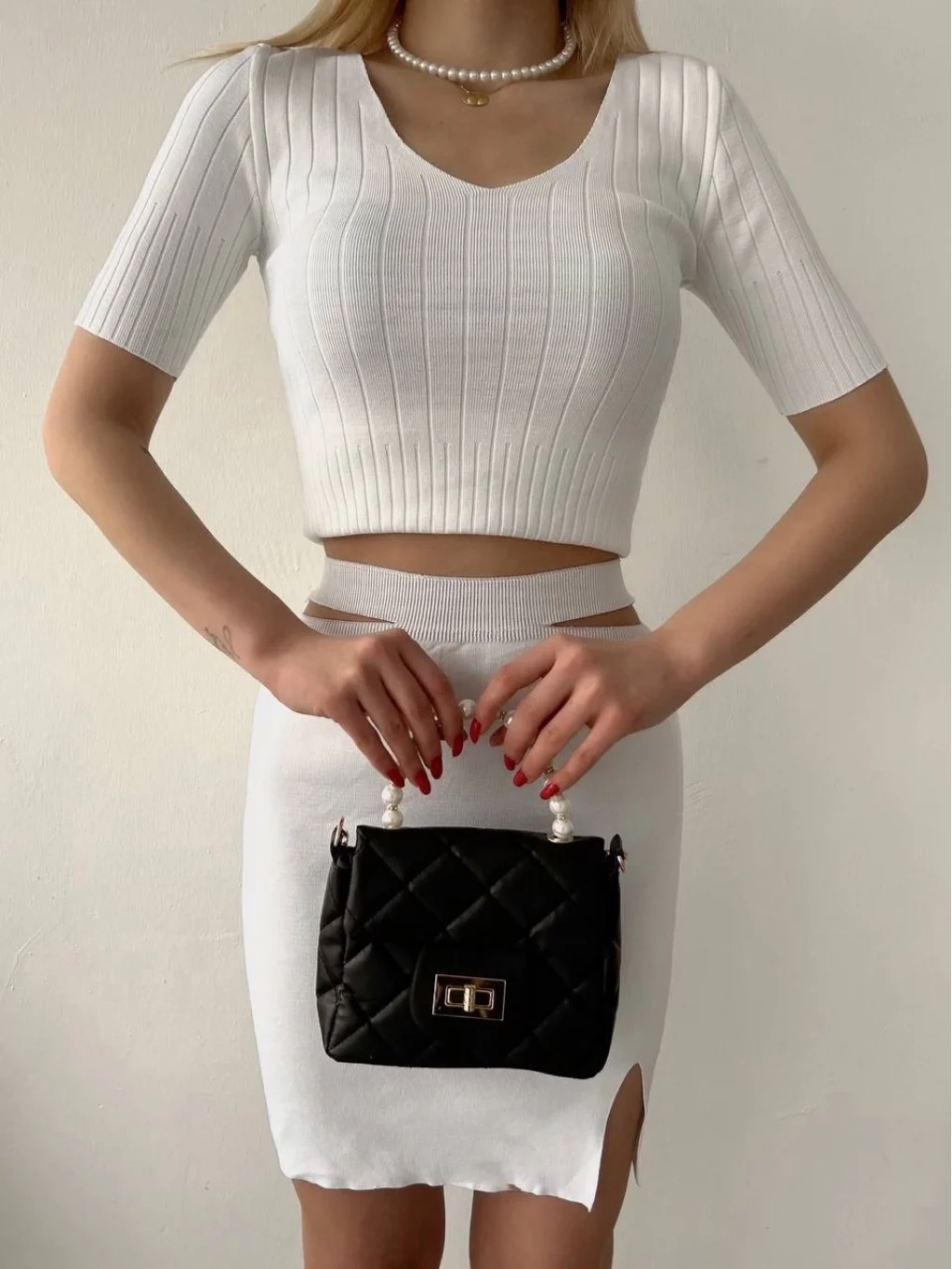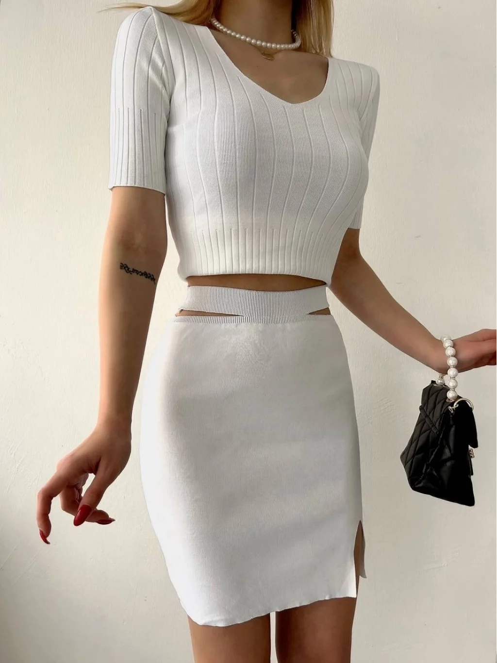 Şıklığı ve konforu bir arada sunan Etekli Triko Takım Beyaz T23107, gardırobunuzun vazgeçilmezi olmaya aday!