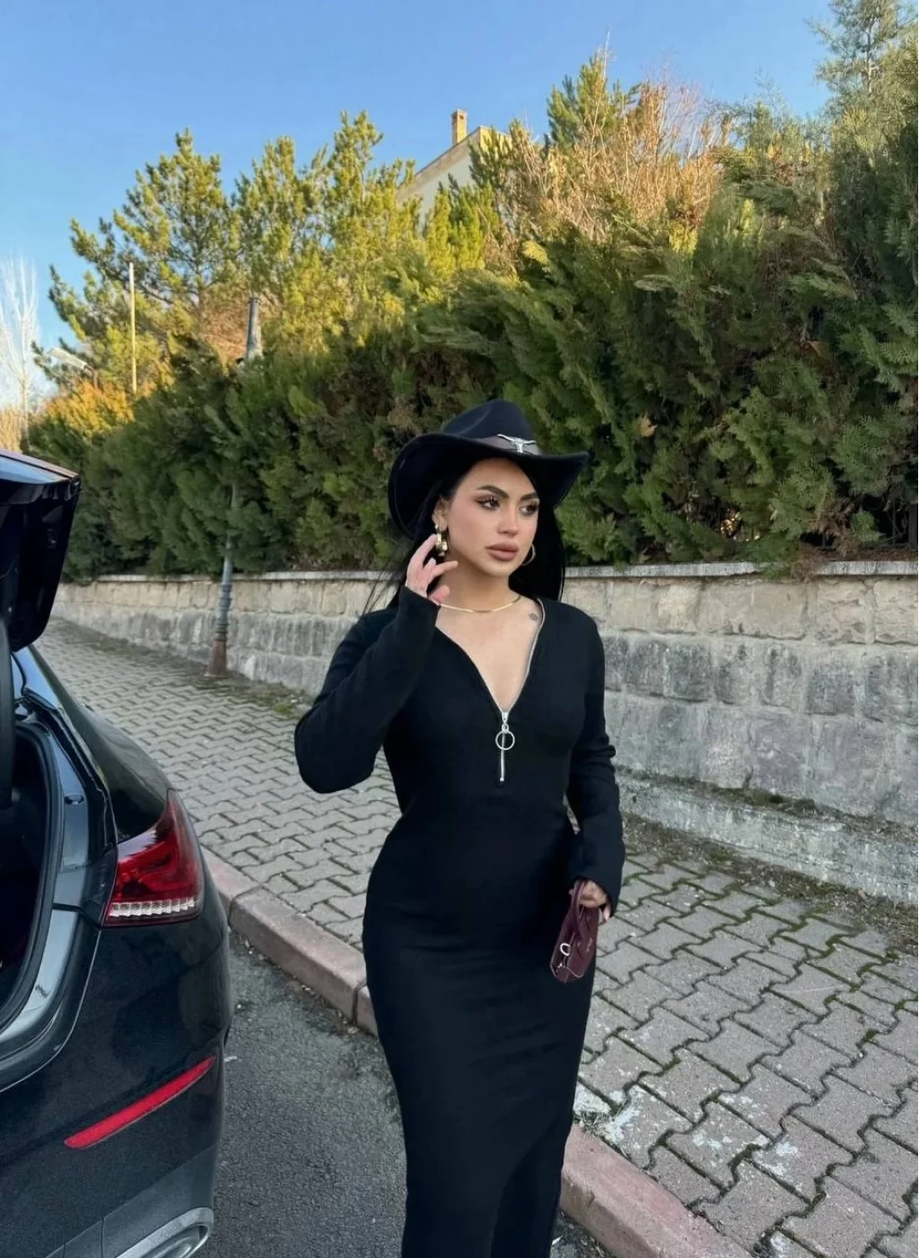 Bu şık elbise, vücudu saran fitilli kesimiyle modern bir görünüm sunarken, fermuar detayıyla da fark yaratıyor.