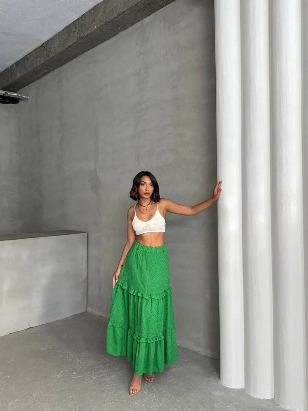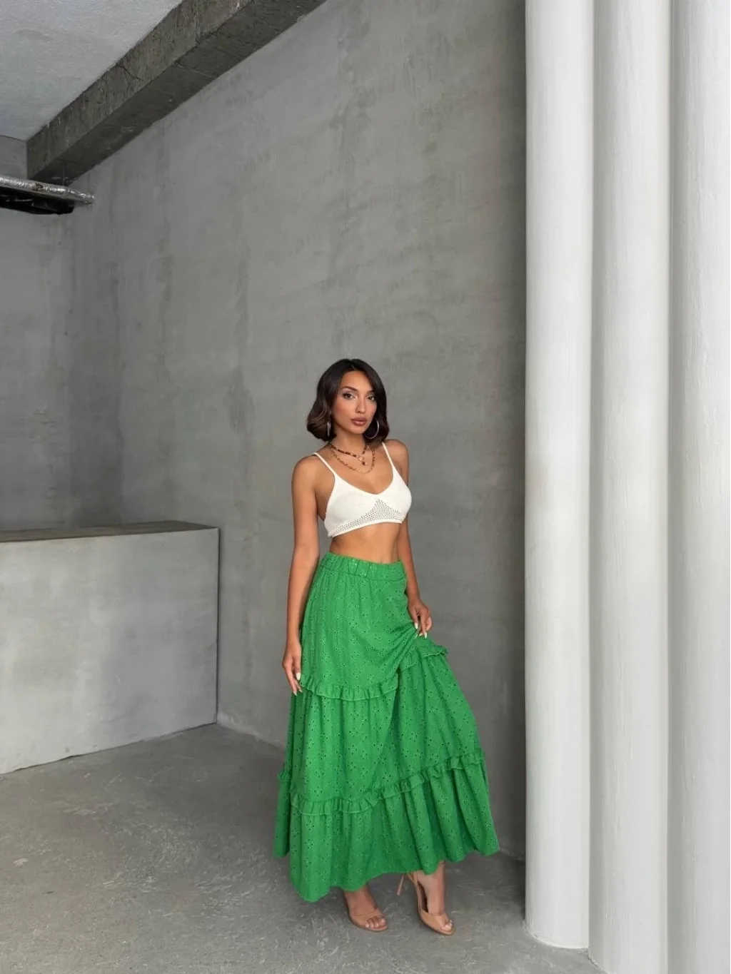 Bu sezonun trendi olan fırfırlı detaylarla hareket katan yeşil uzun eteğimiz, gardırobunuzun vazgeçilmezi olmaya aday! Çift taraflı brode işlemeleri ile şıklığı ve zarafeti bir arada sunan tasarım, her durumda size şıklık katacak. Astarlı yapısı sayesinde rahatça kullanabileceğiniz eteğimiz, şık bluz ve topuklu ayakkabılarla kombinleyerek göz kamaştırıcı bir görünüm elde etmenizi sağlayacak.