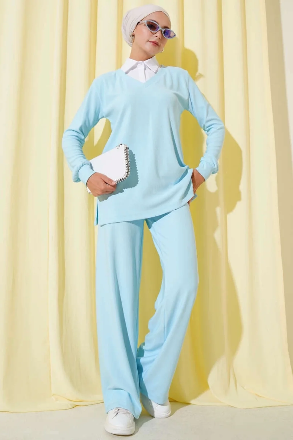 İster günlük hayatta, ister özel bir davette kombinleyerek tarzınızı yansıtabileceğiniz Gömlek Yaka Fitilli Salaş İkili Takım Buz Mavisi T4300, şıklığı konforla buluşturuyor.