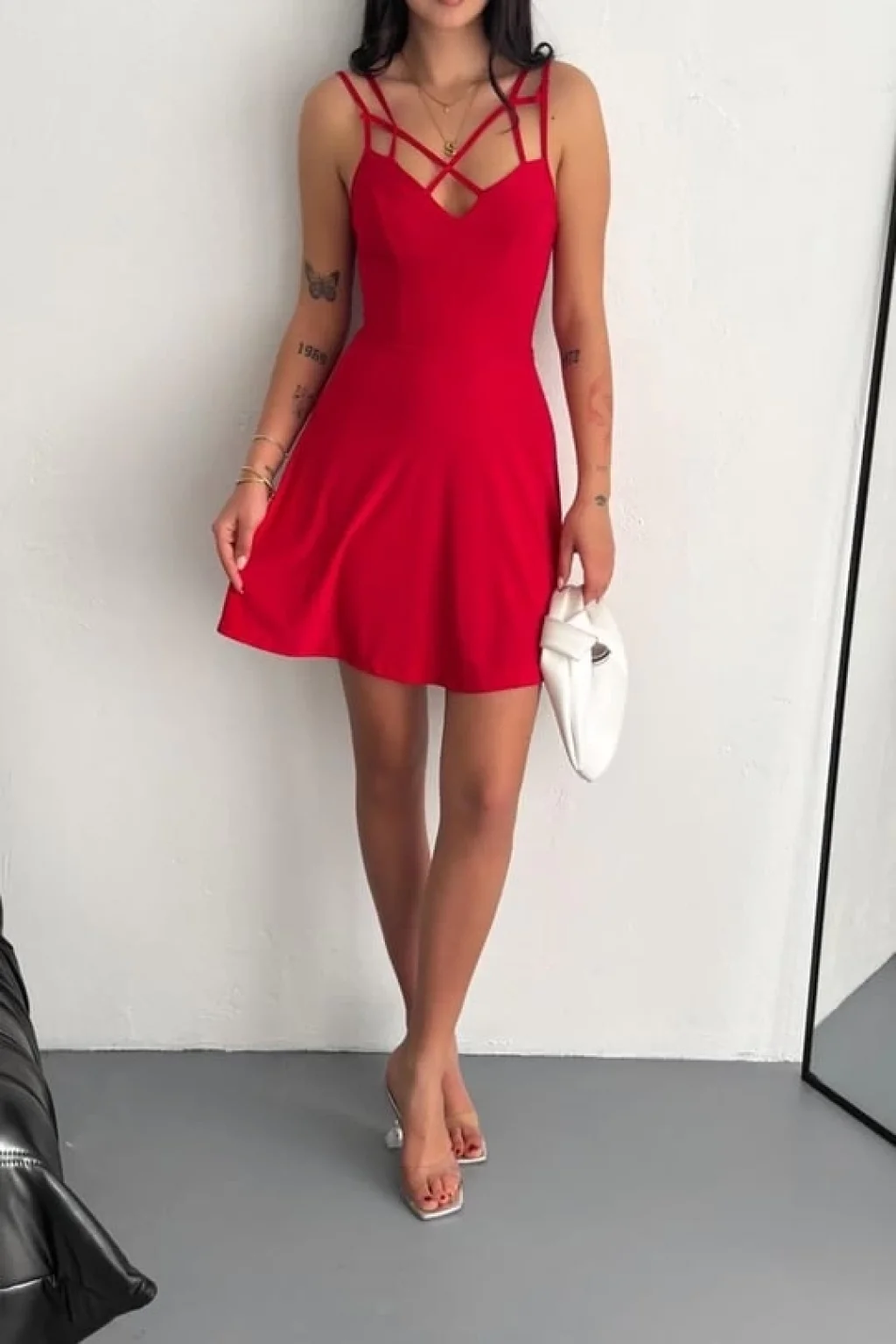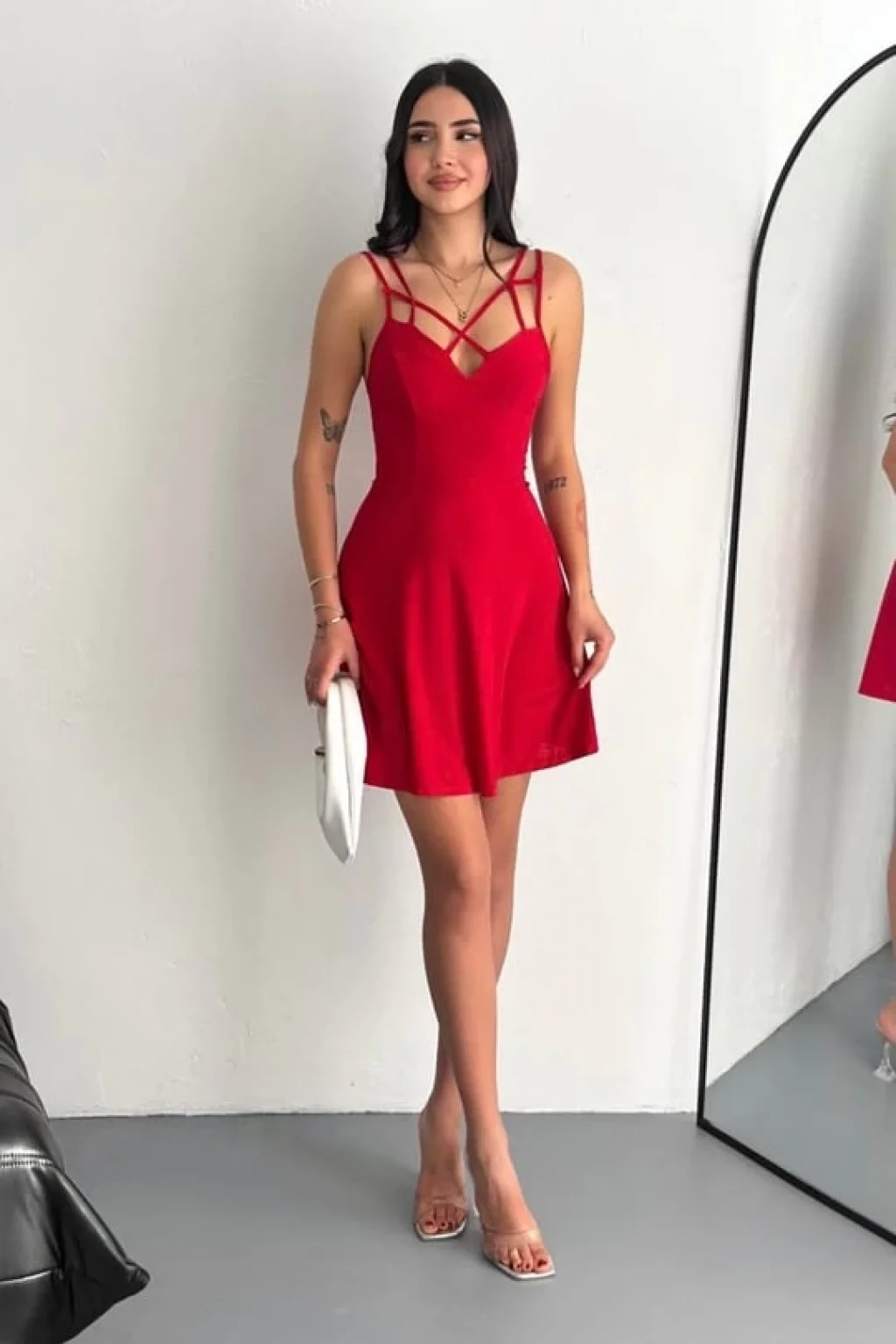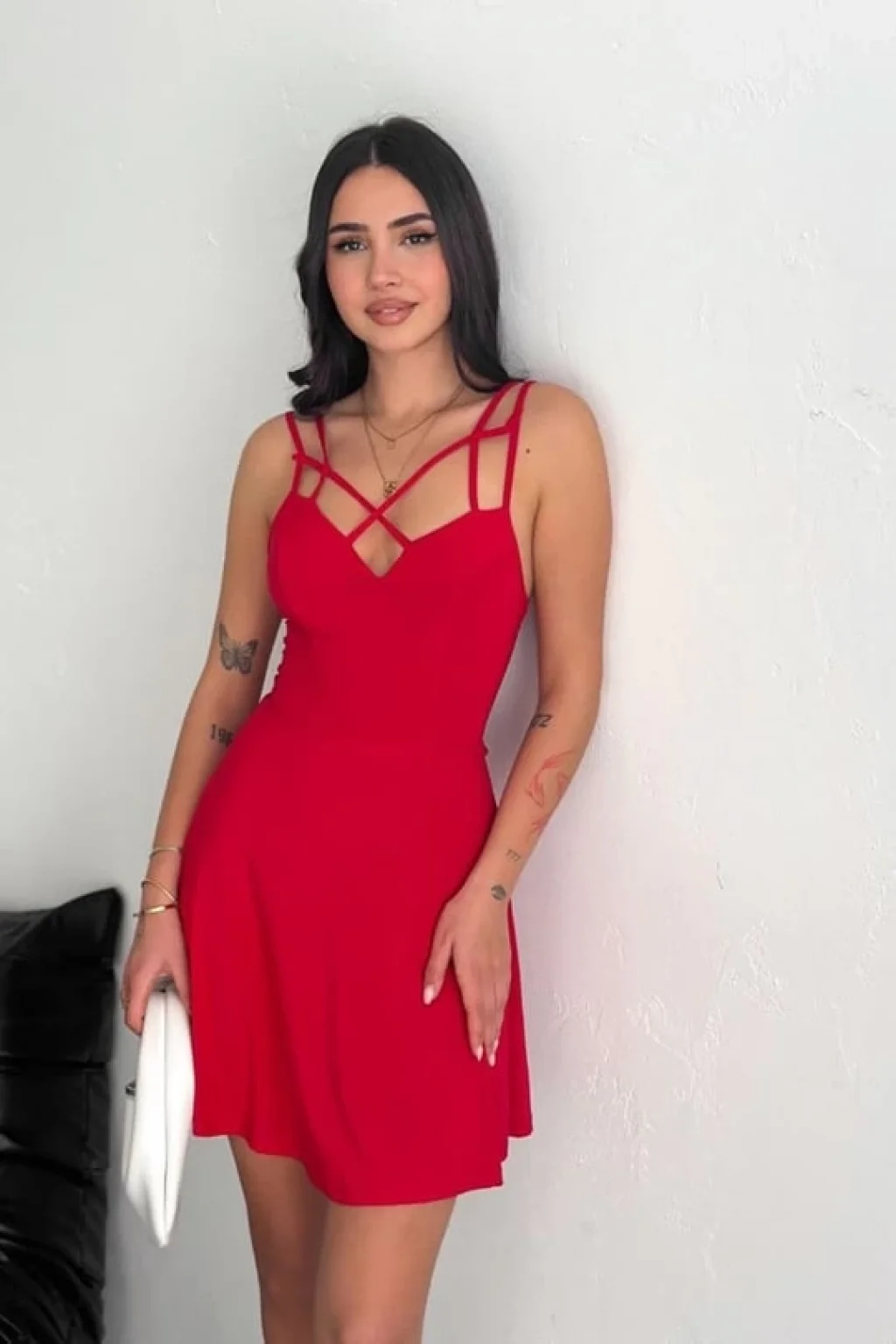 Kadınların şık ve şıklığıyla ön plana çıkmalarını sağlayacak ince çift askılı mini elbise, gardırobunuzun vazgeçilmezi olmaya aday.