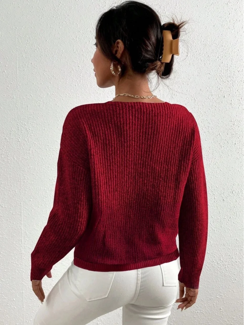 İncili Çapraz Kazak Bordo, şıklığı ve rahatlığı bir arada sunar.