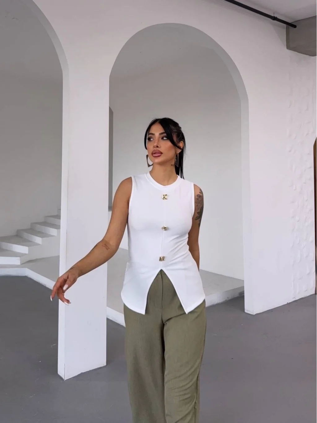 Şıklığı ve rahatlığı bir arada sunan Kadın Beyaz Bisiklet Yaka Gold Düğmeli Ottoman Bluz S2310, günlük kullanımdan özel davetlere kadar birçok farklı kombinle harika görünmenizi sağlar.