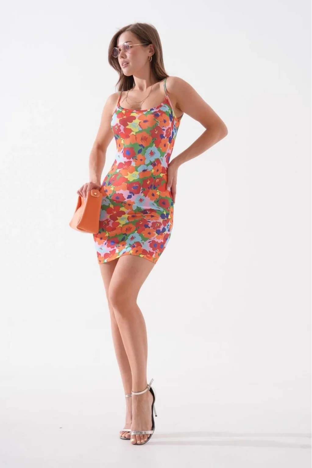 S8105 modeli ince askılı desenli elbise, özgün tasarımı ile şıklığı ve konforu bir arada sunuyor.