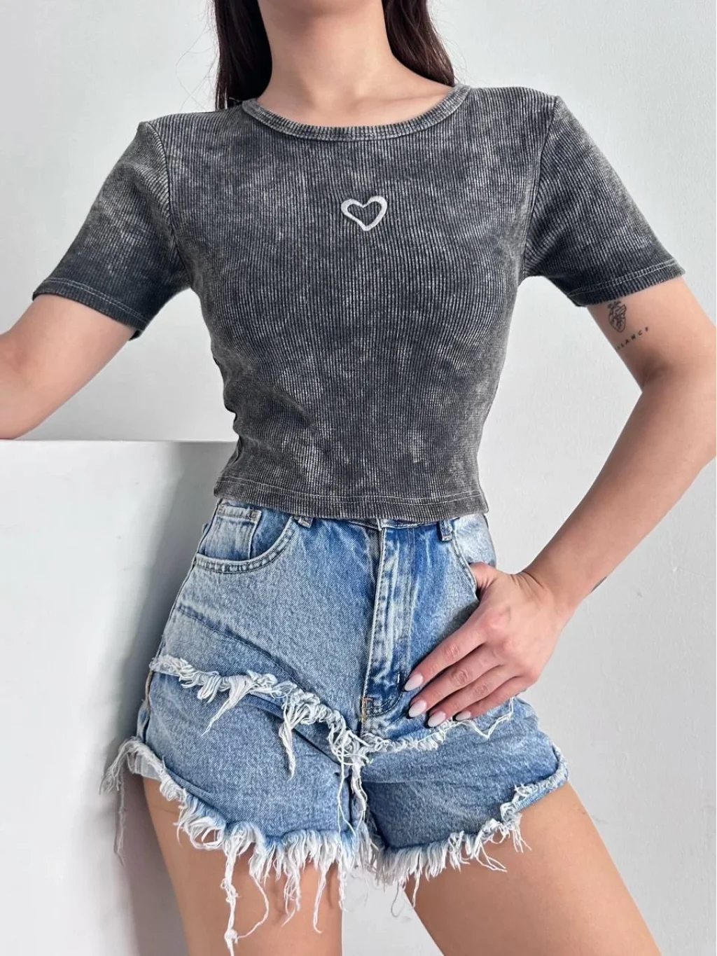 Bu sezonun trendlerine uygun, şık ve şık kalp nakışlarıyla süslenmiş Asit Yıkanmış Bluz S3479, gardırobunuzun favori parçalarından biri olmaya aday!