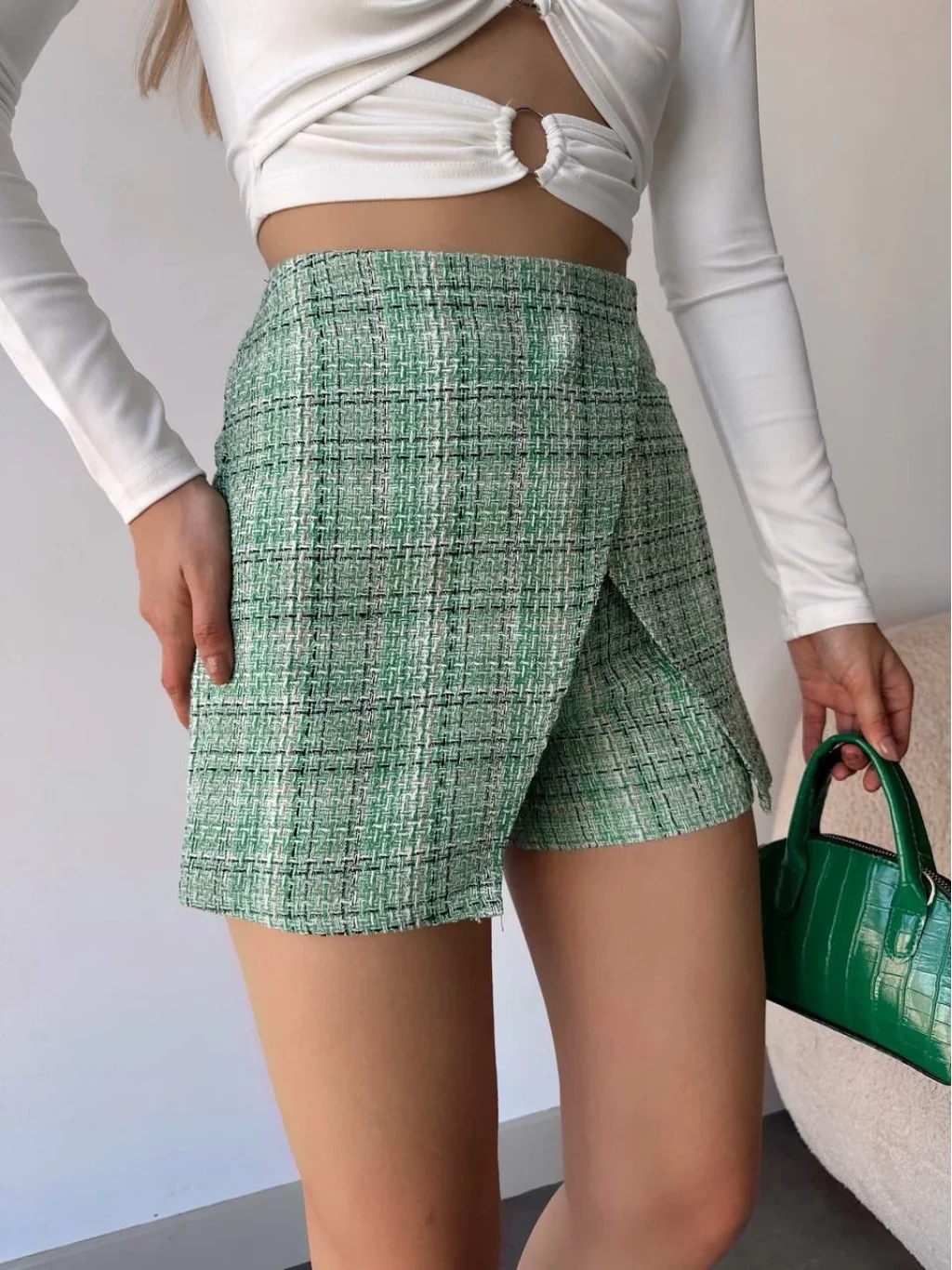 Şık ve rahat tasarımıyla dikkat çeken Kapaklı Tüvit Şort Etek Yeşil, gardırobunuzun vazgeçilmez parçalarından biri olmaya aday.