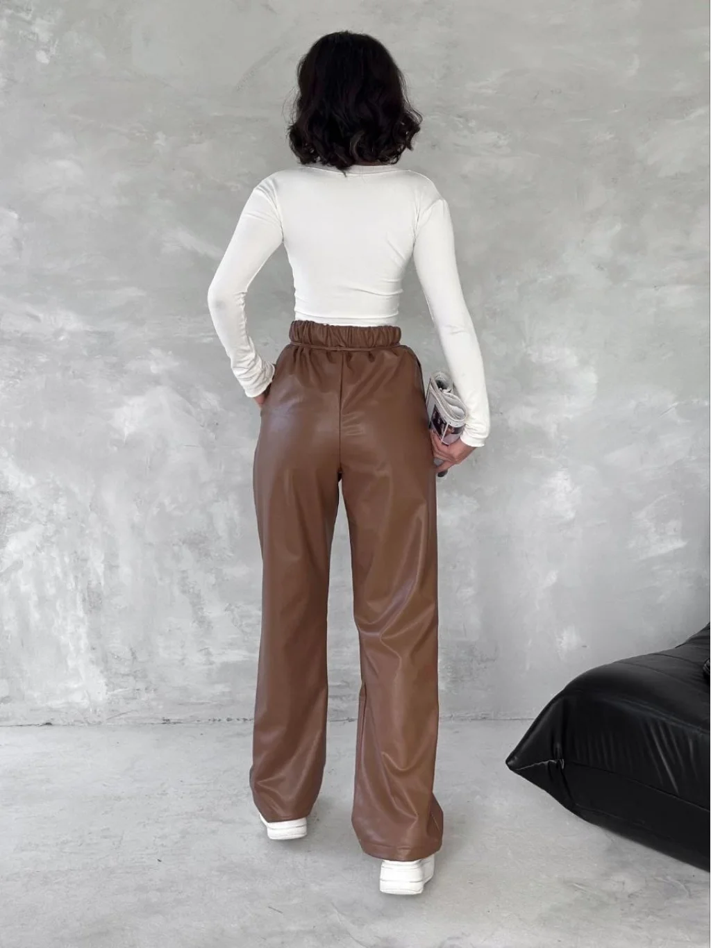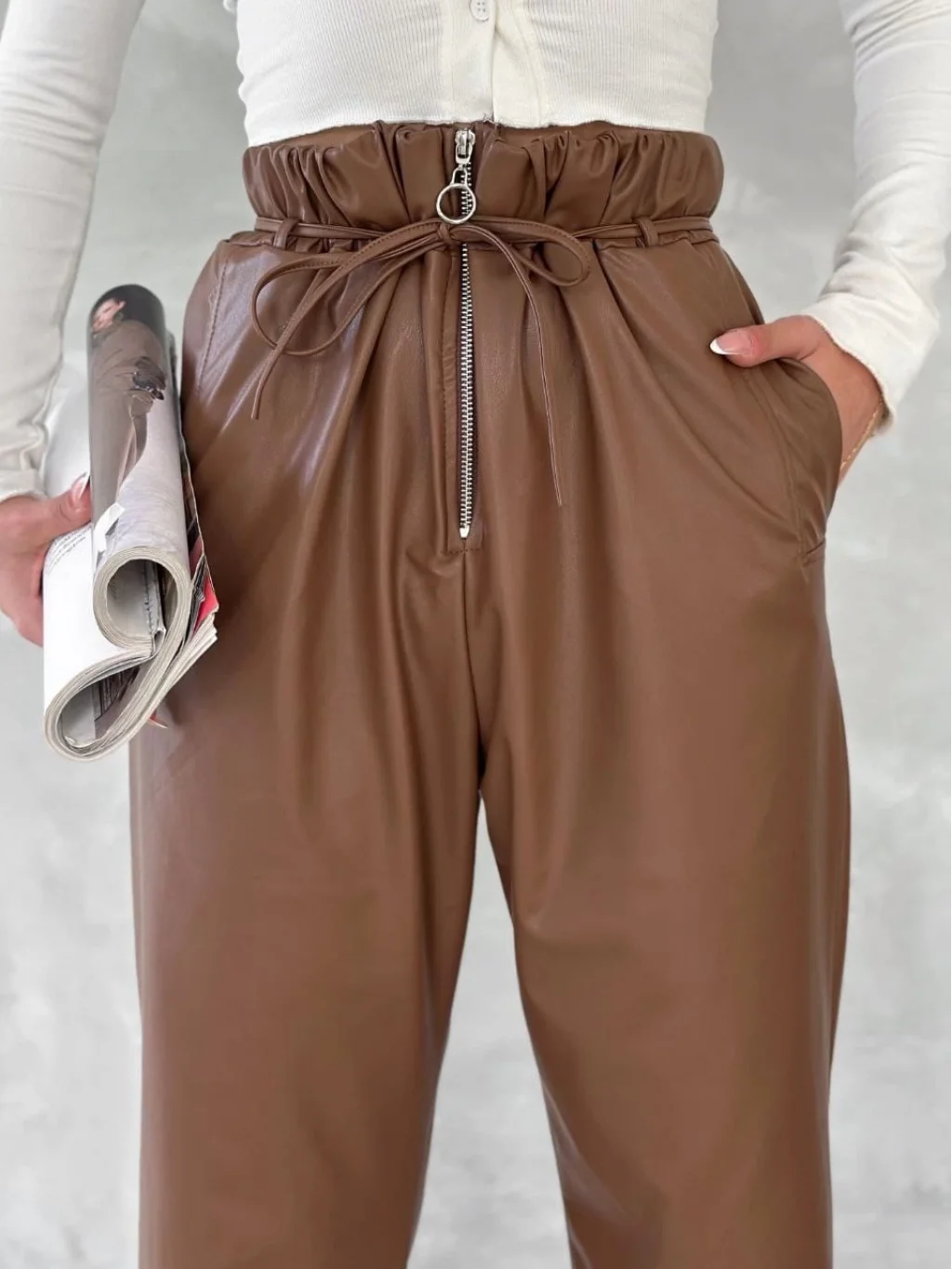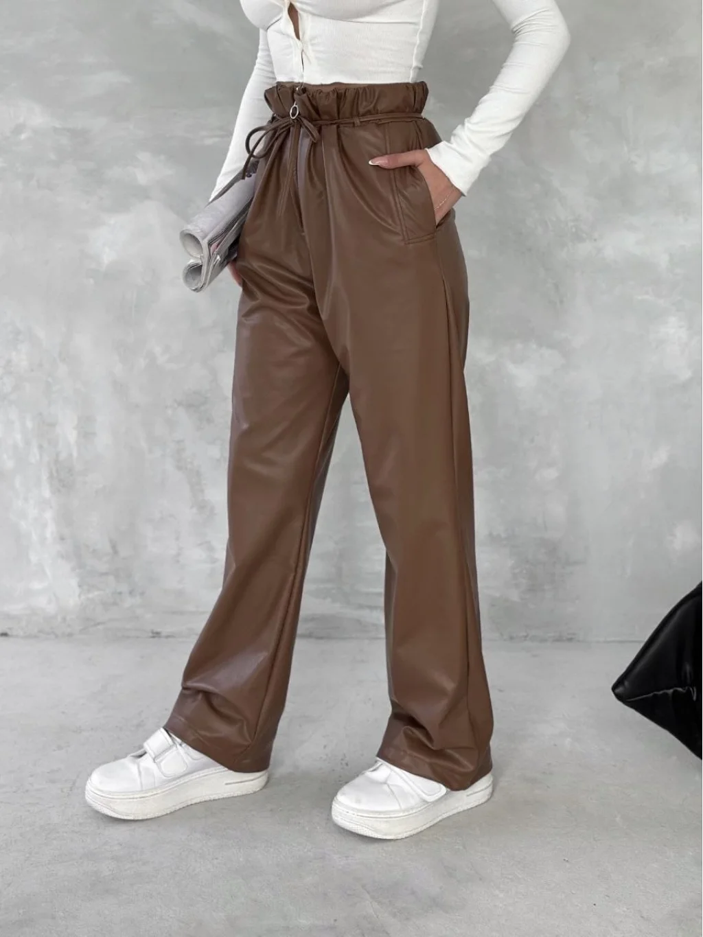 Şıklığı seven kadınların favorisi olmaya aday Kendinden İnce Kemerli Deri Pantolon Kahve T1178, hem şık hem de rahat bir seçenek arayanların tercihi olacak!