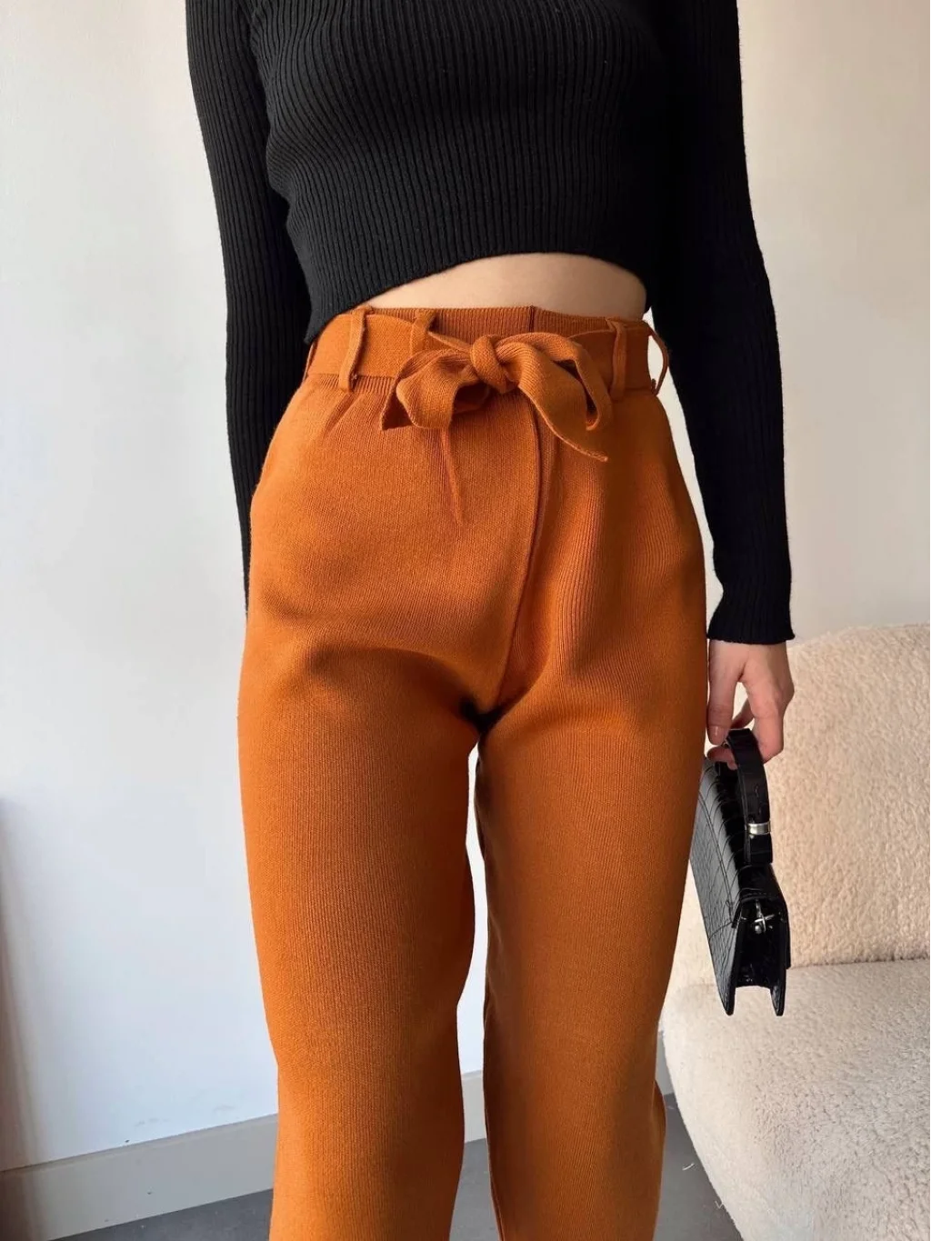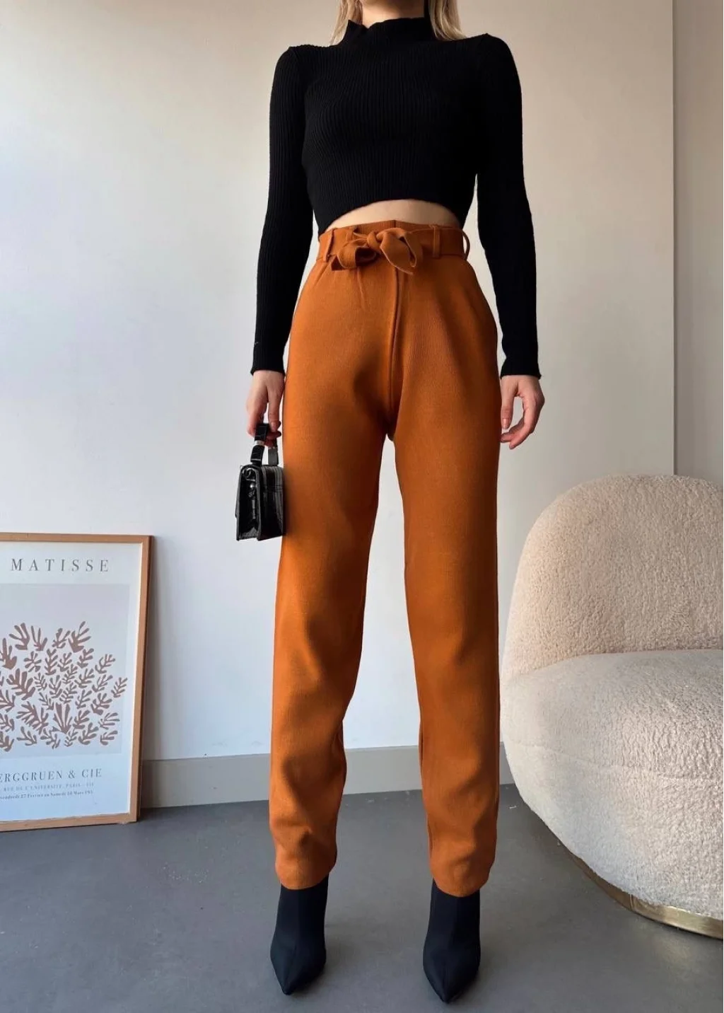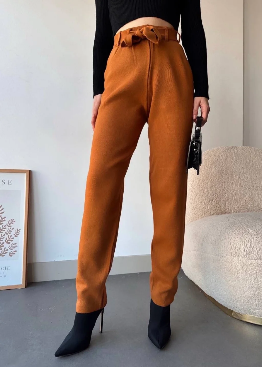 Şıklığı ve rahatlığı bir arada sunan Kendinden Kemerli Triko Pantolon Camel, gardırobunuzun vazgeçilmezi olmaya aday!