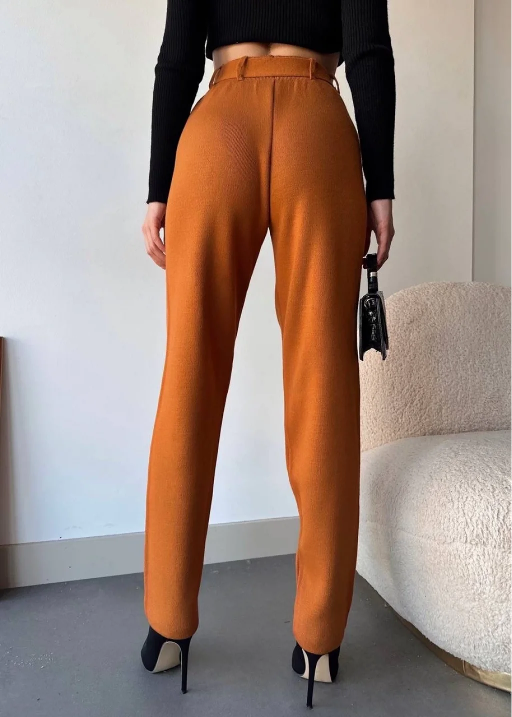 Ofis şıklığında ya da günlük kombinlerde tercih edebileceğiniz Kendinden Kemerli Triko Pantolon Camel, şıklığı ve konforu bir arada arayan kadınların favorisi olacak!