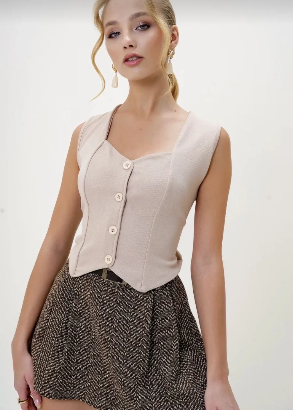 Yeni sezonun trend parçası krep kumaş düğmeli yelek bej s3395, şıklığı ve rahatlığı bir arada sunuyor.