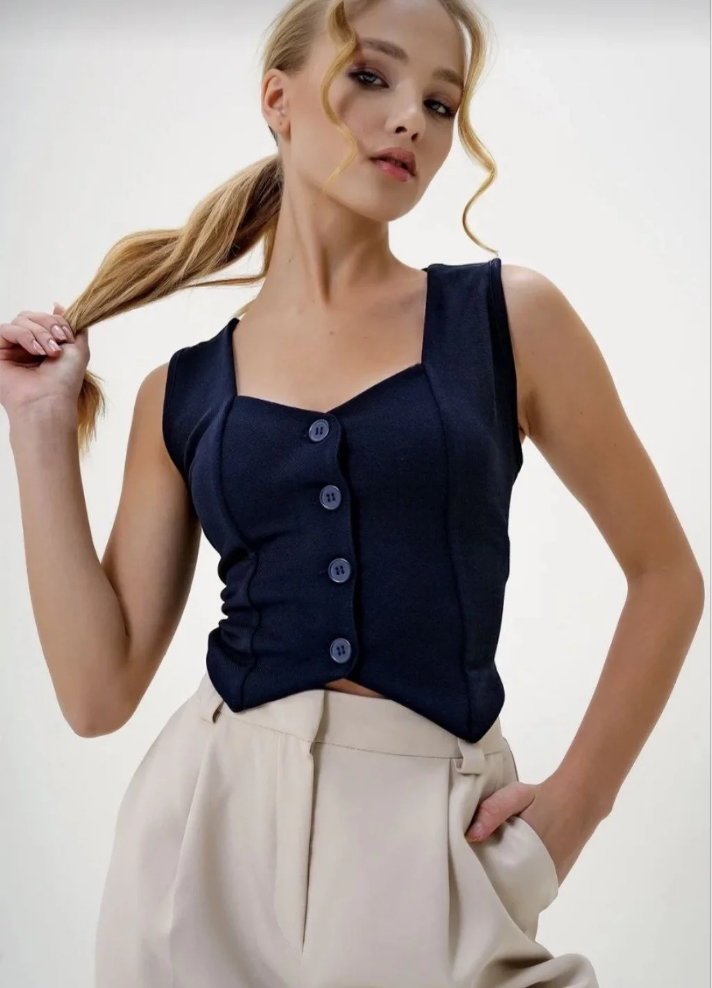 Modaya uygun tasarımı ve pratik kullanımıyla Krep Kumaş Düğmeli Yelek Lacivert S3395, kombinlerinizi tamamlamak için ideal bir seçenektir.