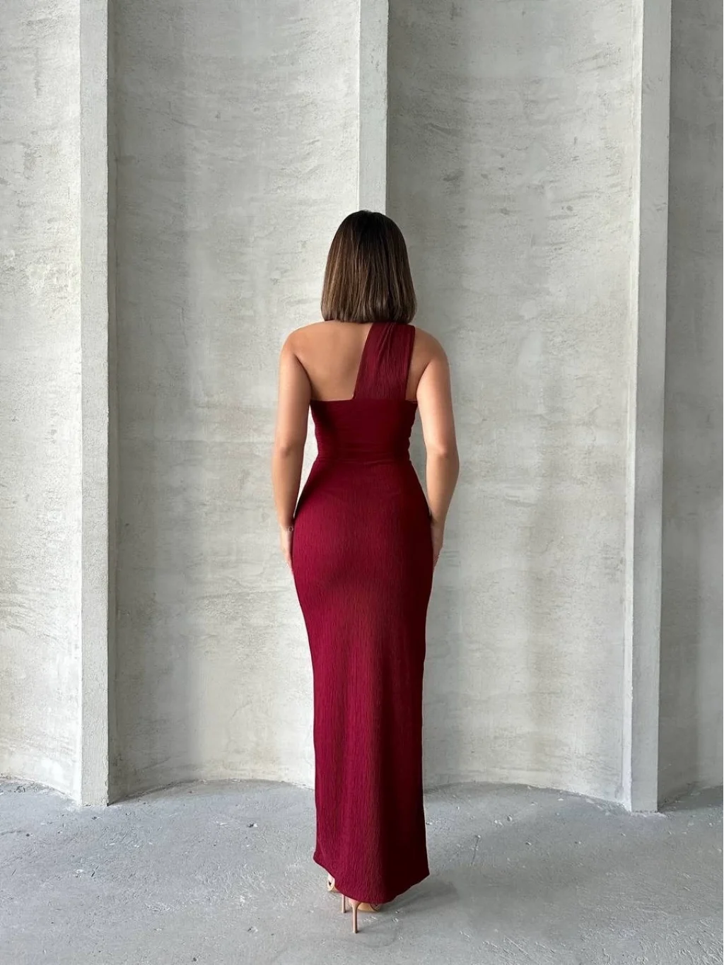Krinkıl tek omuz uzun elbise bordo S25455, şıklık ve rahatlığı bir arada sunar.
