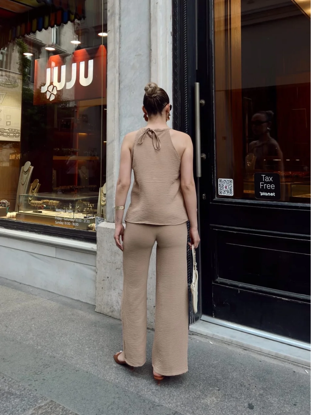 Bej rengiyle her kombinasyona uyum sağlayan s054 model takım, günlük kullanıma ve özel davetlere şıklık katar.