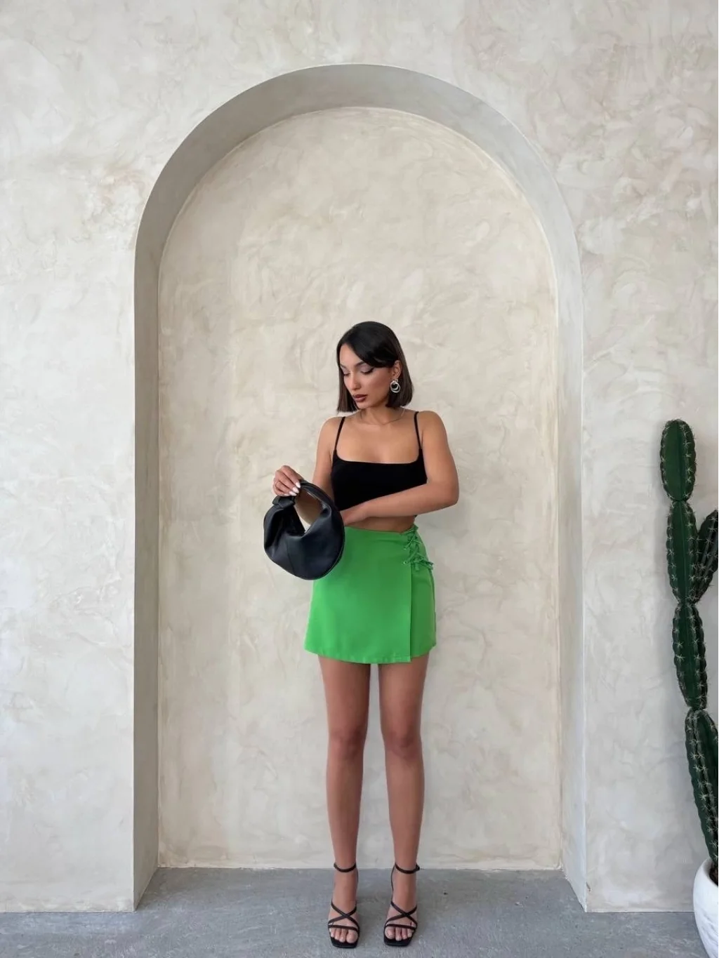 Şık yeşil rengi, yaz aylarında sizi ferah ve stil sahibi gösterecek. Yazın vazgeçilmezi olan şort etek, her kombinle rahatlıkla uyum sağlar.