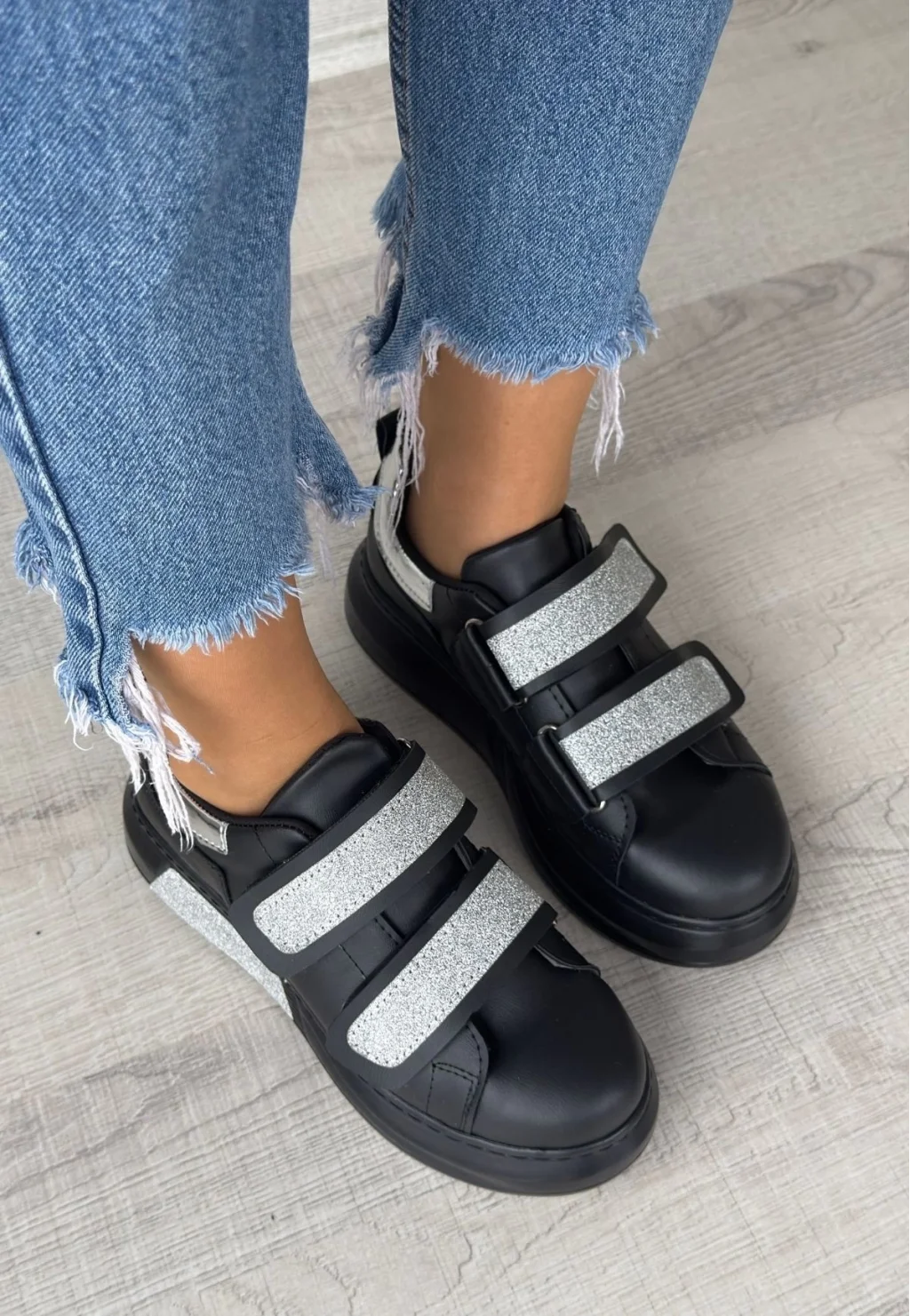 Nino Siyah Cilt Simli Cırt Cırtlı Spor Ayakkabı