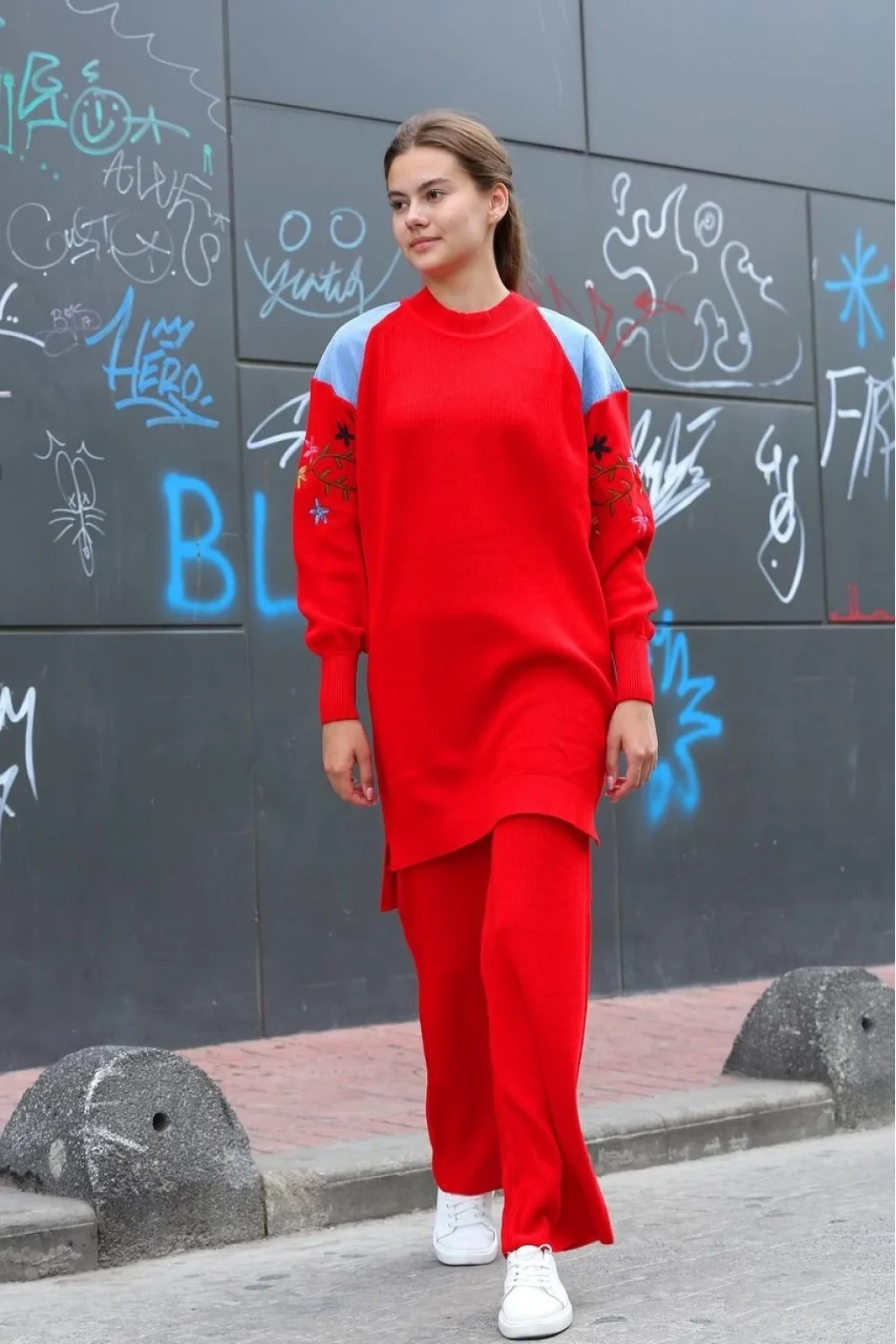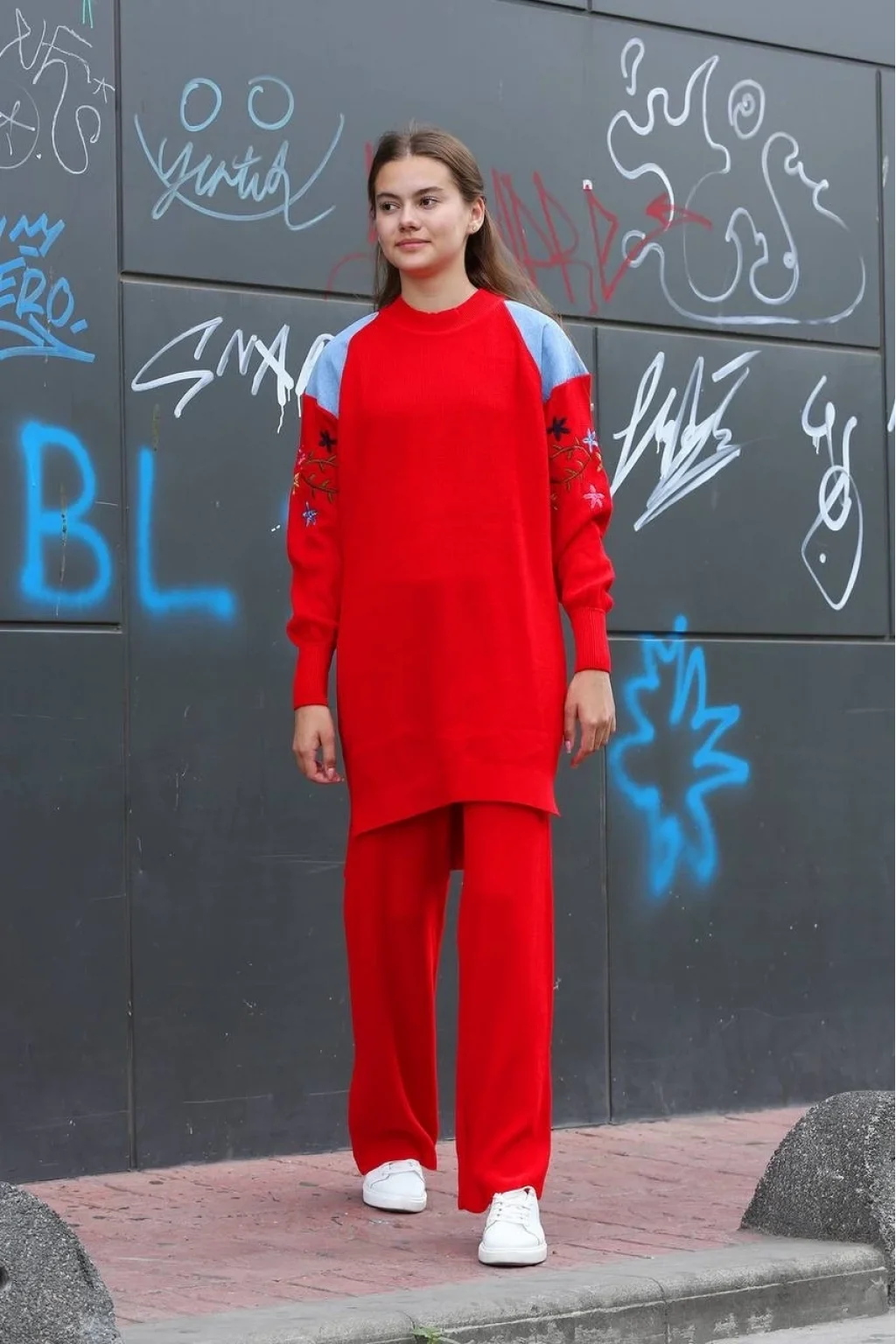 - Kırmızı renkli triko takım, şıklığı ve rahatlığı bir arada sunar.
