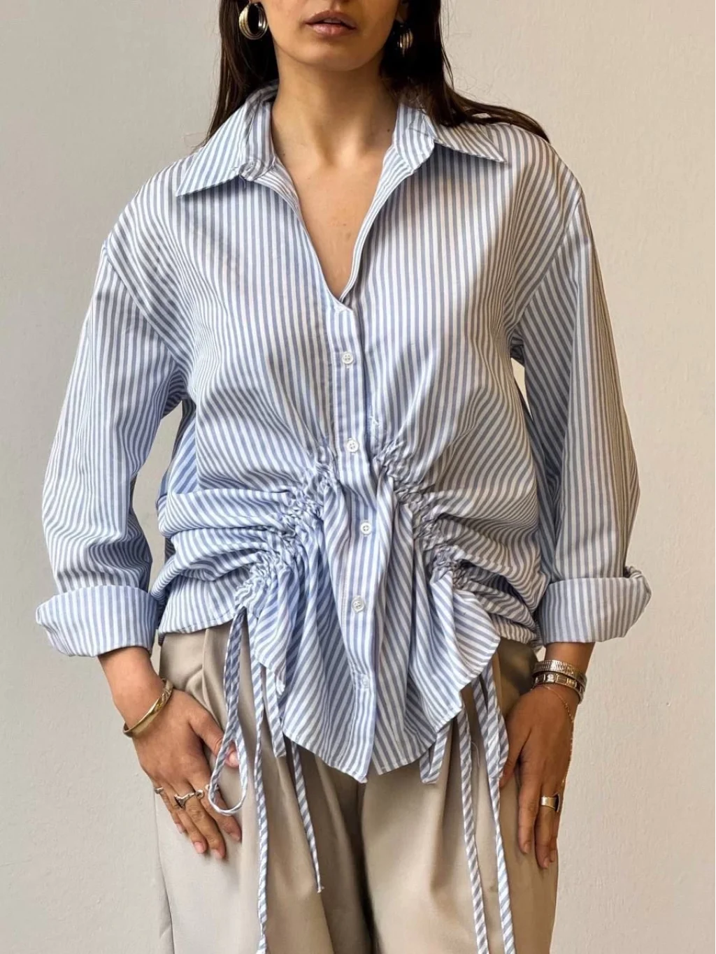Önü büzgü detaylı çizgili gömlek, şıklığı ve rahatlığı bir arada sunuyor.
