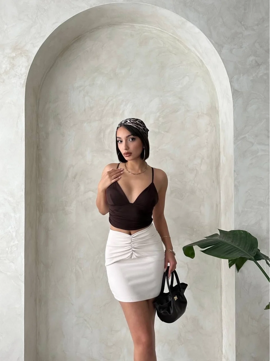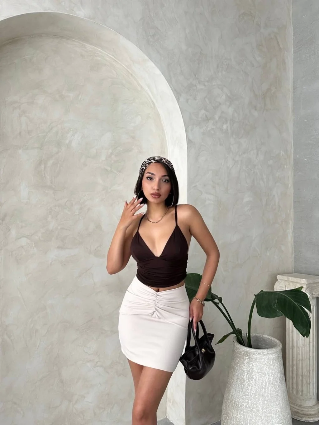 Şık ve modern tasarımı ile dikkat çeken önü büzgülü etek