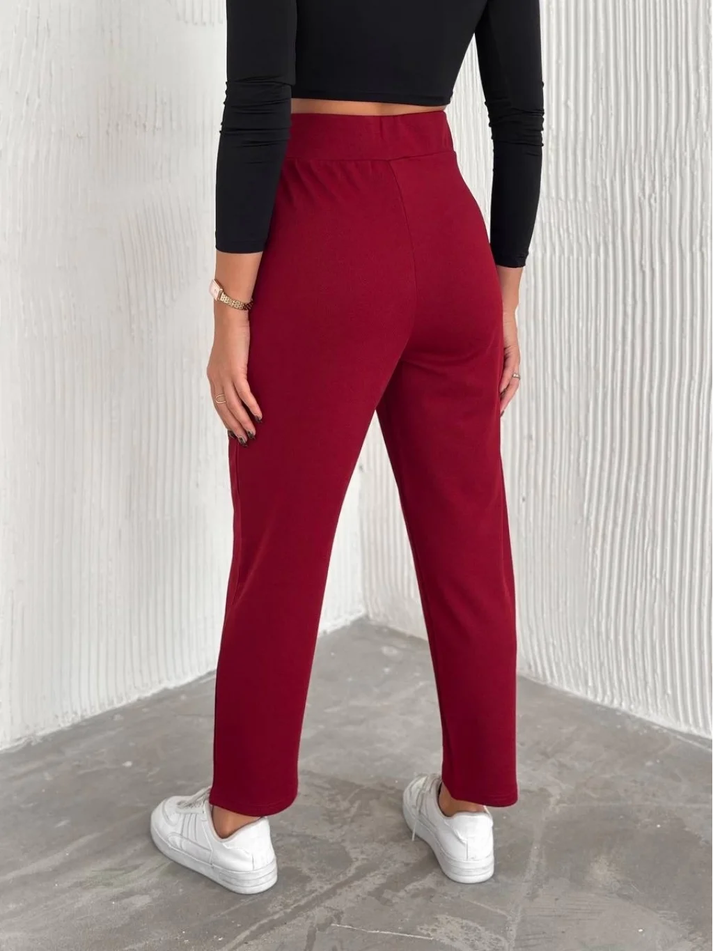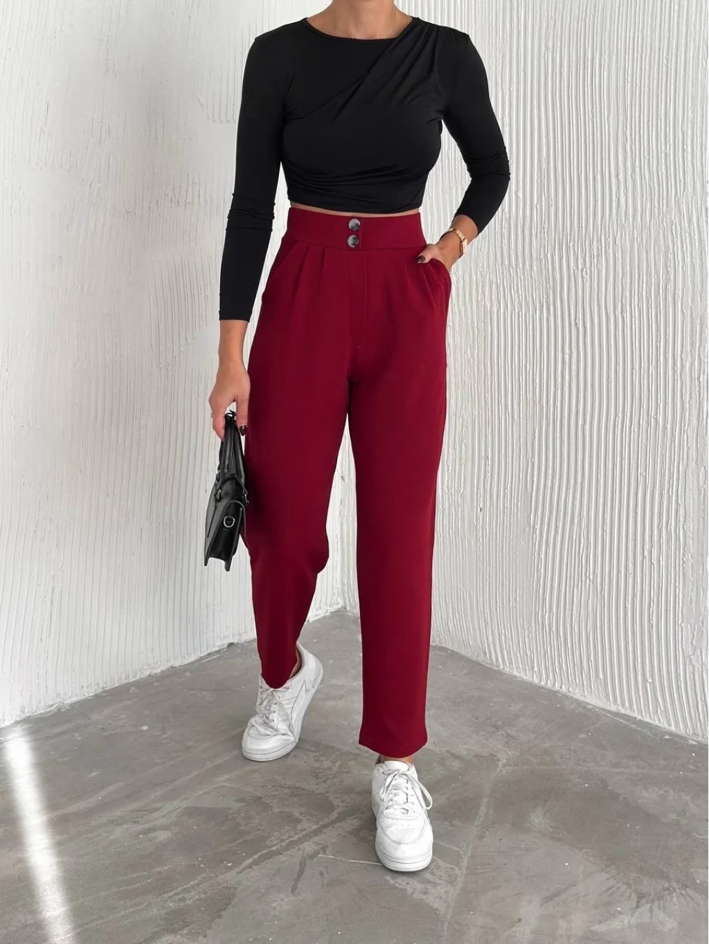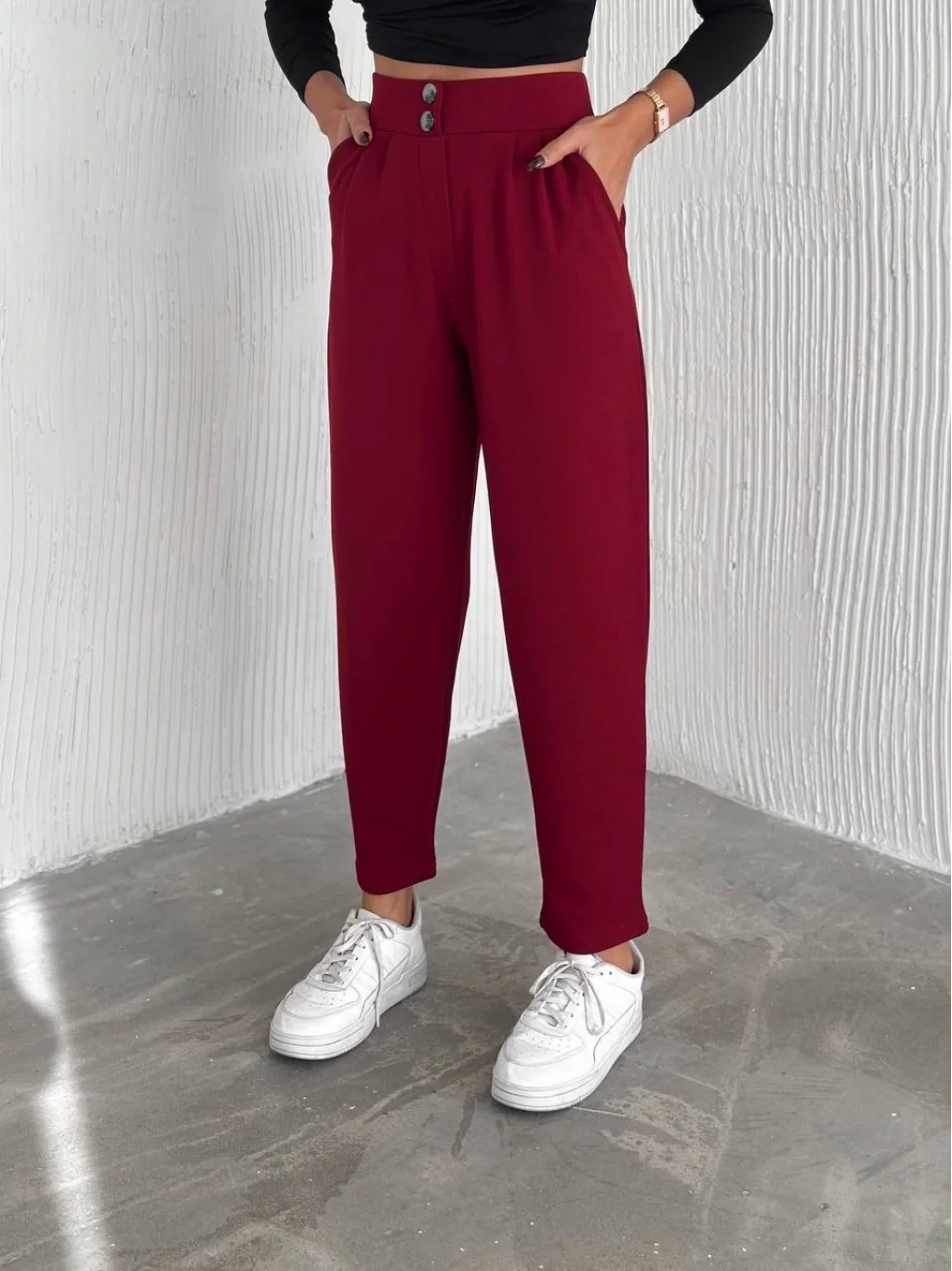 Kazax marka örme krep pantolon çift düğmeli modeli, şıklığı ve konforu bir arada sunar.
