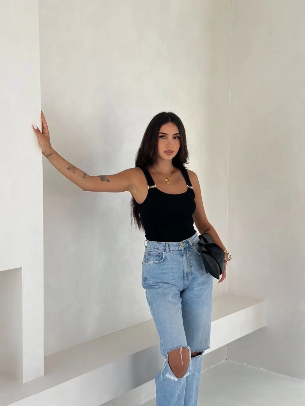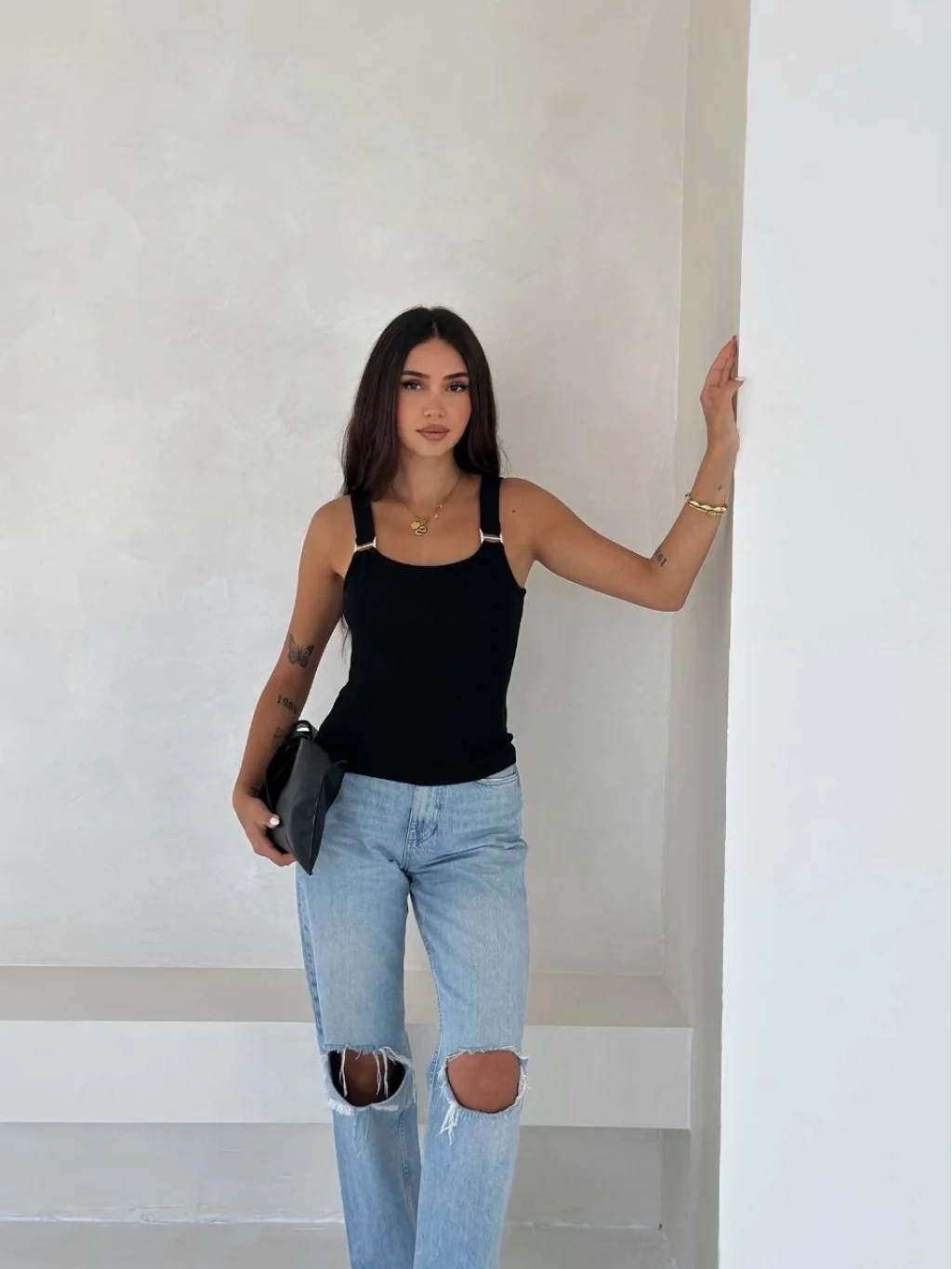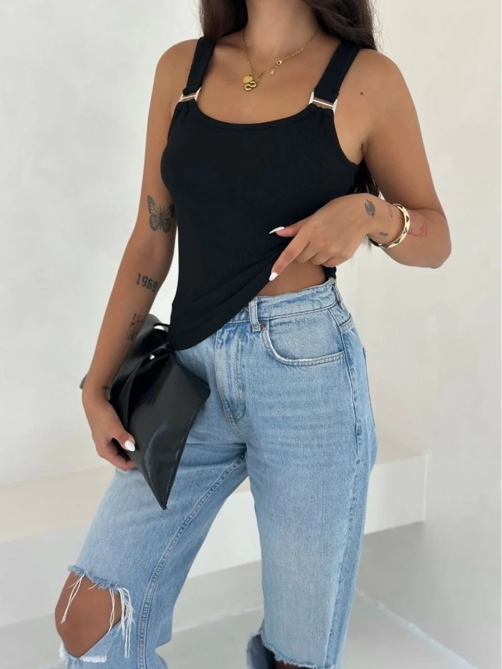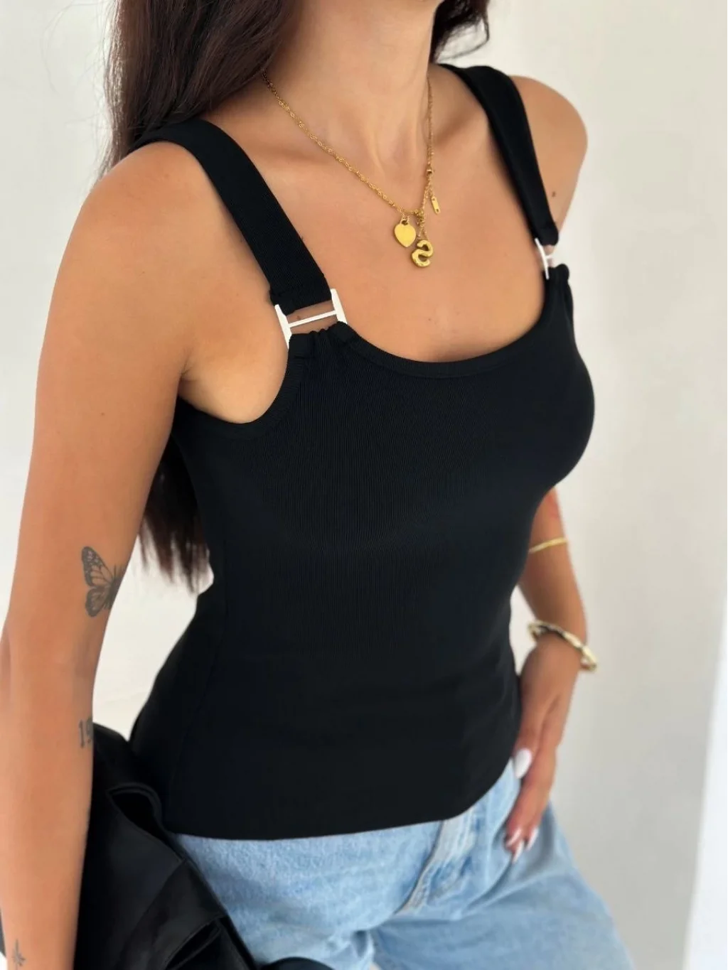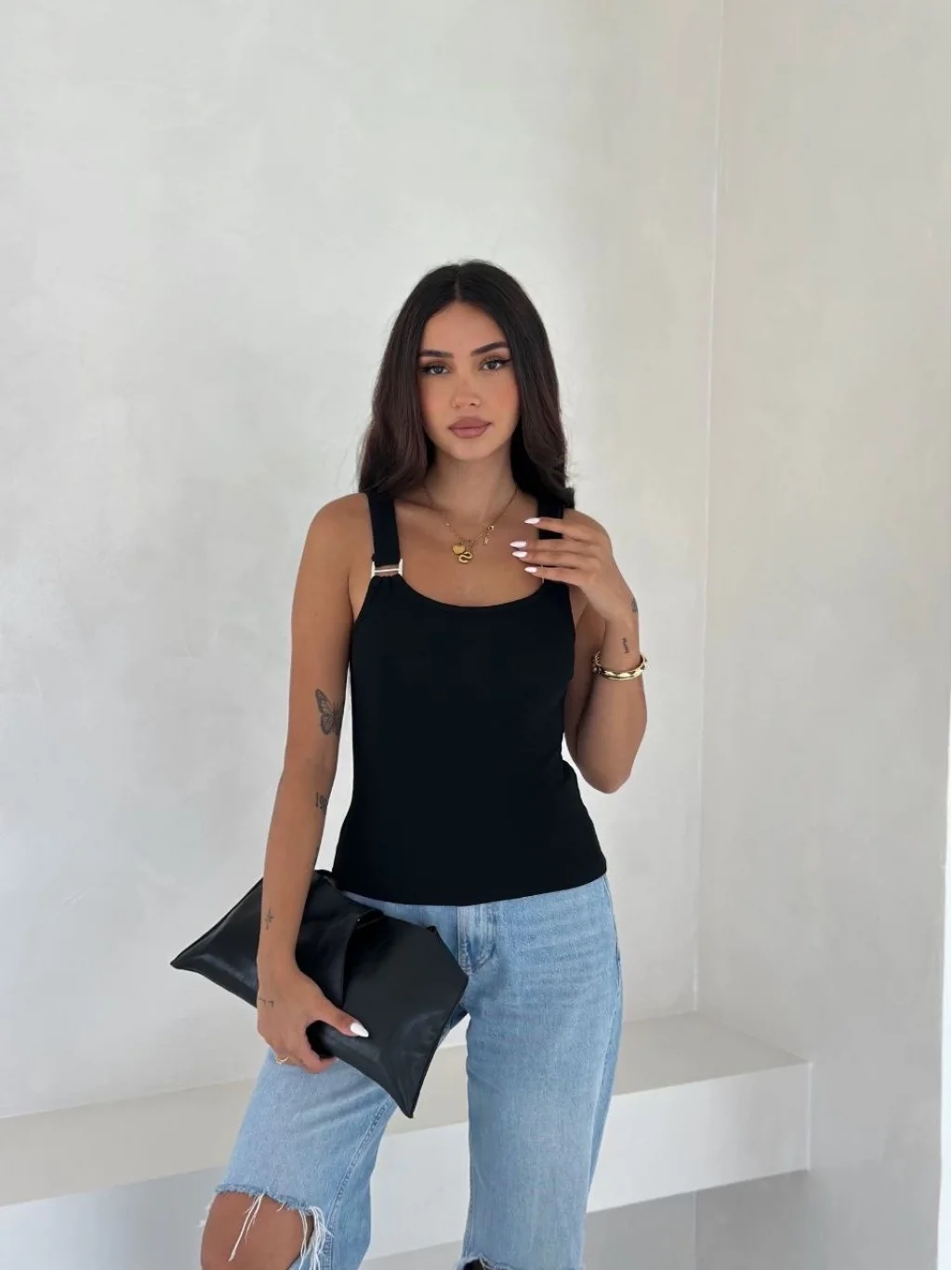 İnce askıları ve dikkat çekici toka detayıyla fark yaratan bu bluz, gardırobunuzun vazgeçilmez parçalarından biri olmaya aday.